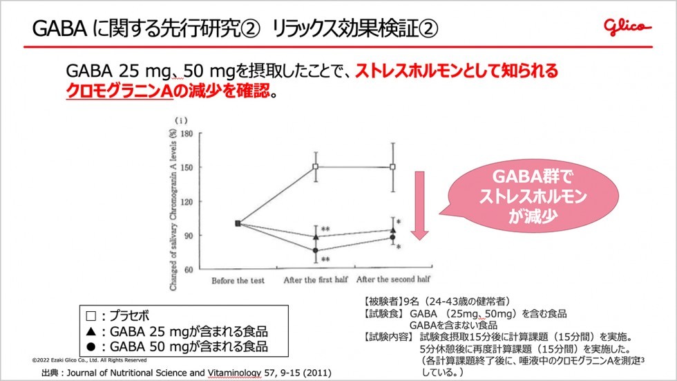 「その結果、何も食べずに就寝したグループに比べて、GABA含有食品を食べたグループは、起床時のスッキリ感も高いことがわかりました。また、GABA含有食品を食べたグループの方が先行研究と同様に、ストレスホルモンの減少傾向が見られました」