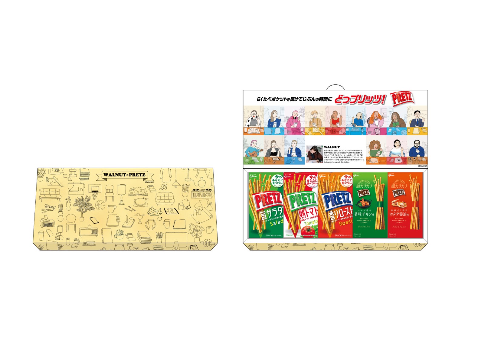 また、同日より、人気イラストレーターWALNUT氏とのコラボレーションによる「らくたべポケット」を活用した、楽しい仕掛けの限定パッケージのプリッツ(小箱5種)を期間限定で発売します。さらに、じぶん時間に活用できる景品が当たるプレゼントキャンペーンも行います。