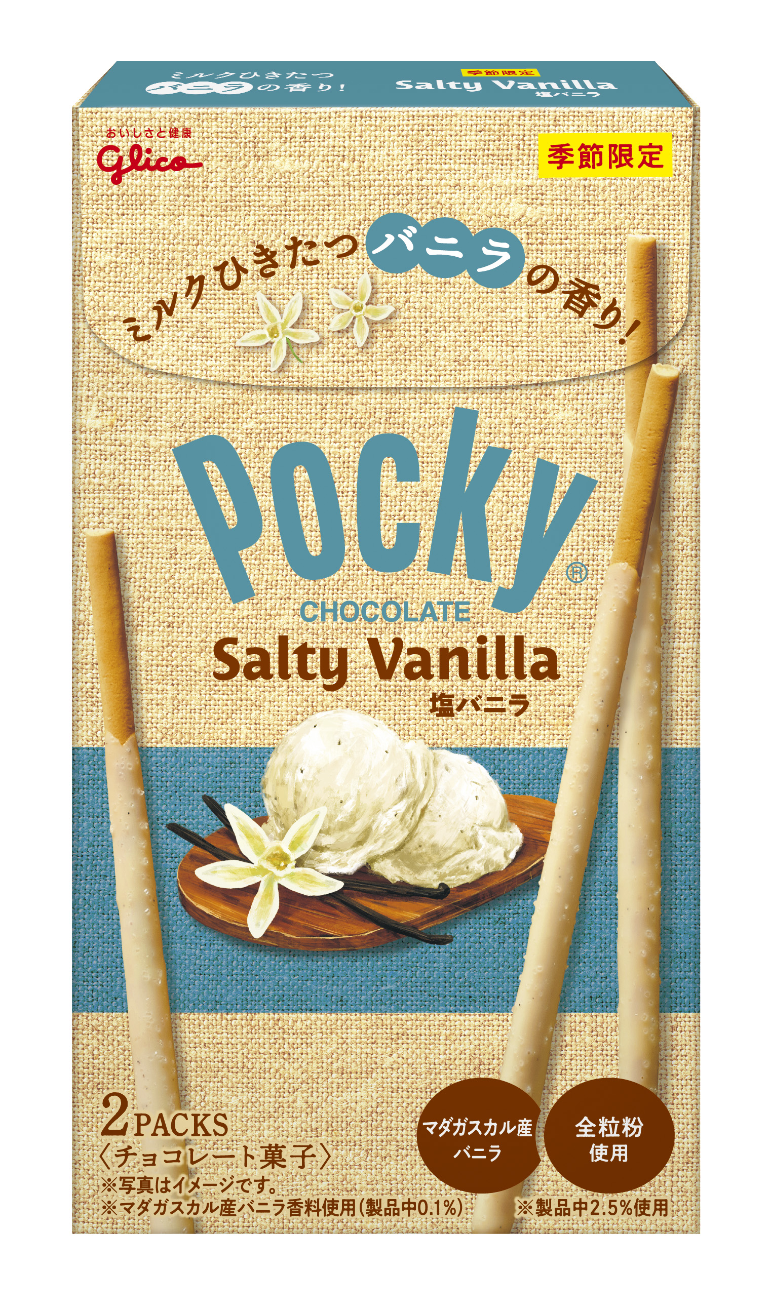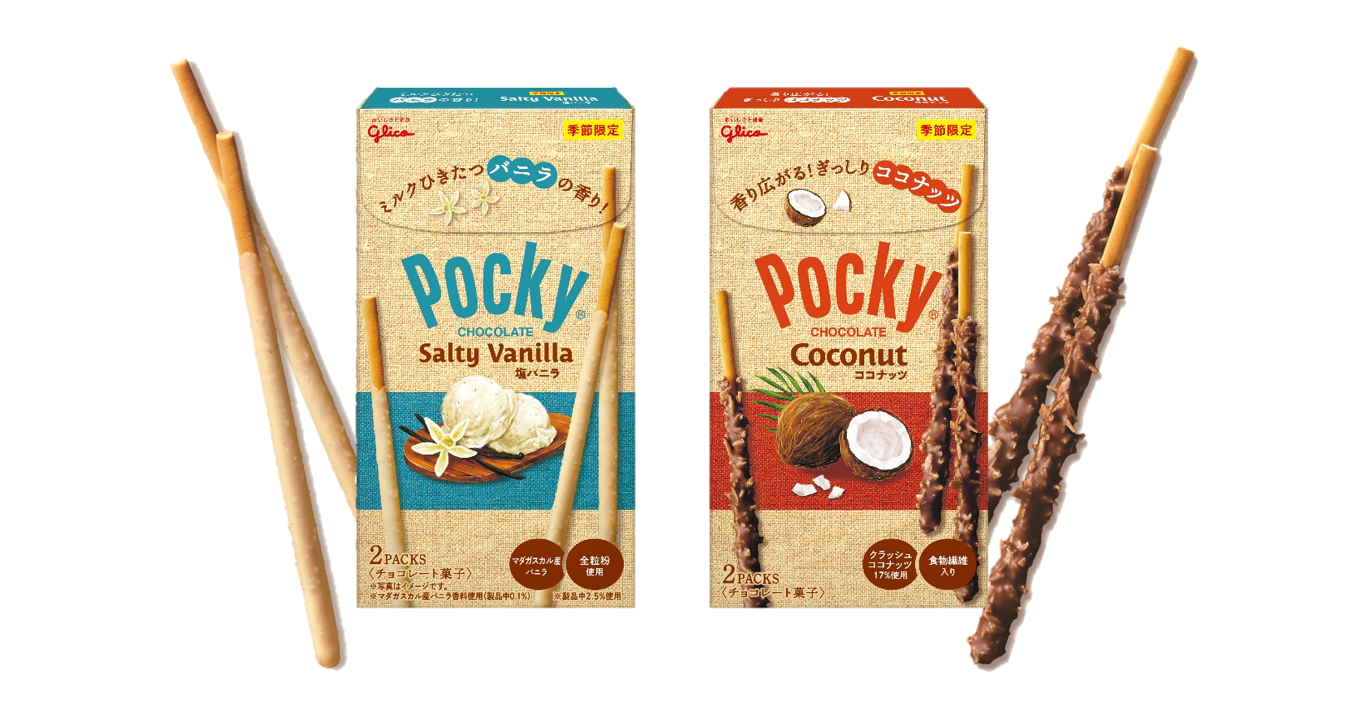 江崎グリコ株式会社は、「ポッキー」の夏季限定品として、バニラ香るチョコレートに塩をトッピングした新商品「塩バニラポッキー」と、プレッツェルにココナッツパウダーを練り込み進化した「ココナッツポッキー」を、2022年5月10日(火)より全国にて数量限定で発売します。