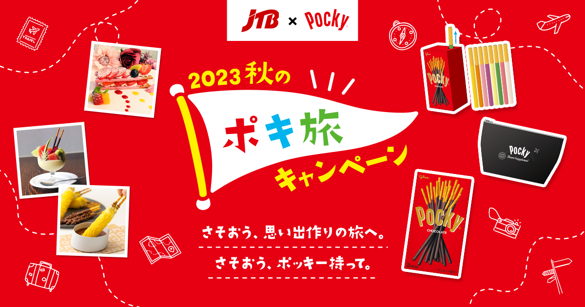江崎グリコ株式会社の「ポッキー」ブランドと、株式会社JTBは、家族や友達との思い出作りの旅となるオリジナル宿泊プランを展開する、「2023秋のポキ旅キャンペーン」を2023年9月14日(木)より開始します。また、10月からは全国のJTB30店舗で申し込み時に旅の行き先をランダムに決められる「ポキ旅くじ」が楽しめたり、コラボ先のホテルにはオリジナルの顔出しパネルを設置したり、両社共同で秋の旅も盛り上げます。