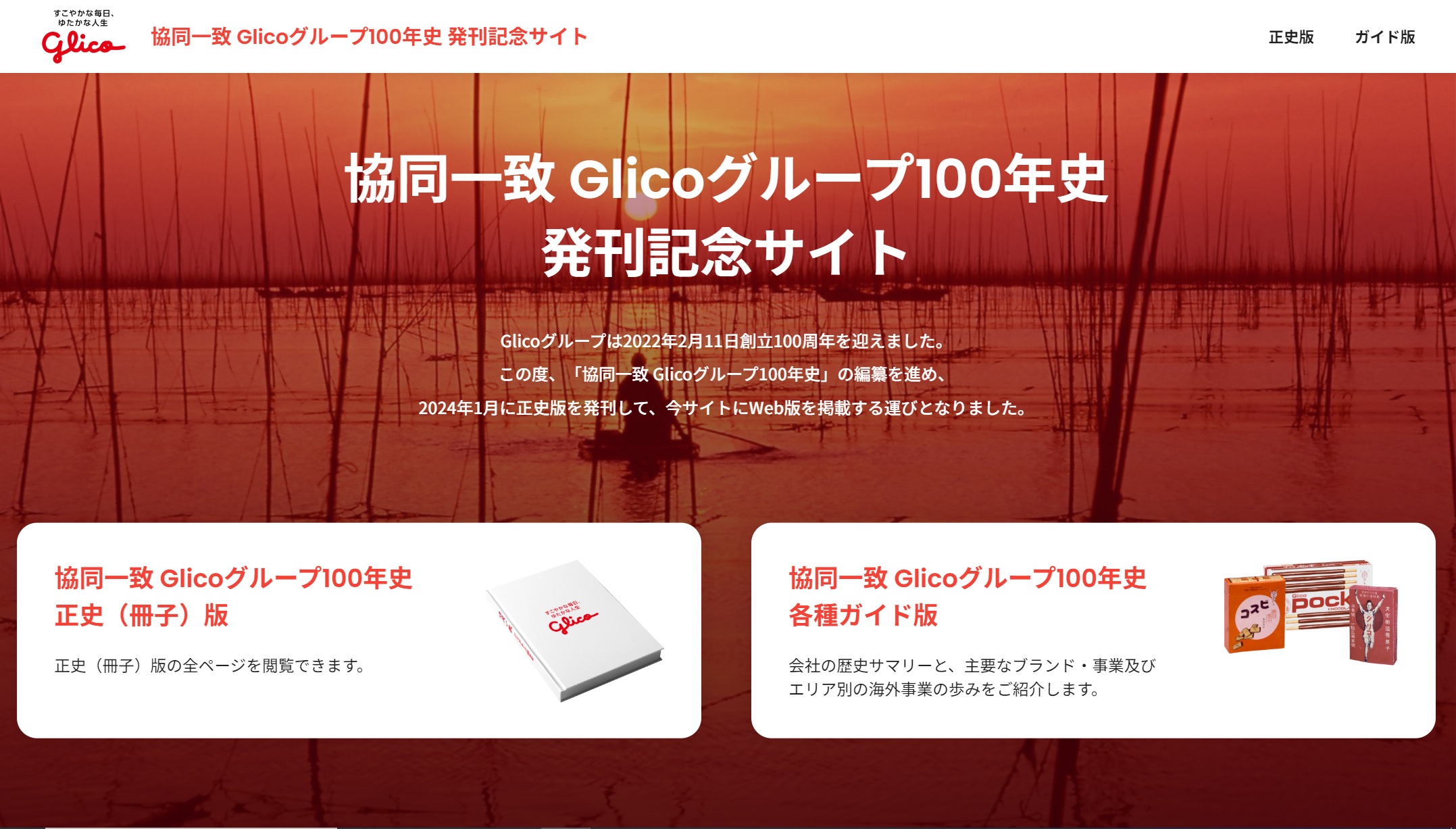江崎グリコ株式会社は1月22日、社史「協同一致 Glicoグループ100年史」を一般公開しました。2022年2月に創立100周年を迎え、100年あまりの歴史を総括した経営通史です。正史版は2023年12月に発刊した冊子の全ページ、ガイド版は日本語と英語を当社公式ホームページの特設サイトに掲載しました。パーパス(存在意義)「すこやかな毎日、ゆたかな人生」の実現に向け、国内外の社員がいつでも、どこでも読み返し、「協同一致」で日々の業務に生かすとともに、ステークホルダーの理解促進につなげます。