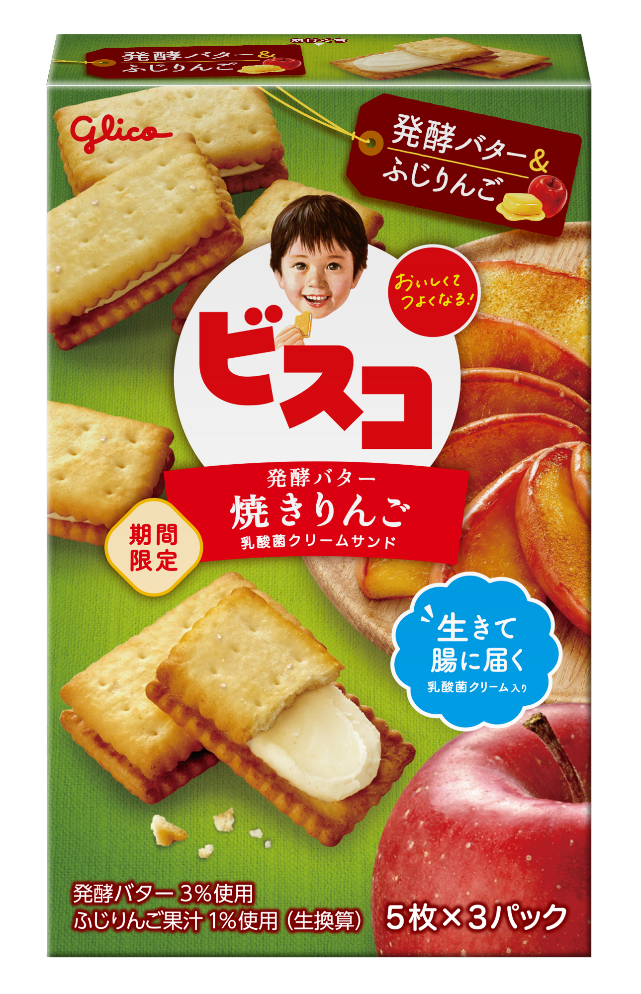「ビスコ」は、シンバイオティクス※の考えに基づき、「生きて腸に届く」乳酸菌と食物繊維を配合した乳酸菌クリームサンドビスケットです。カルシウム、ビタミンD、ビタミン B1、ビタミン B2 がたっぷり入っていることも特長です。そんな「ビスコ」から、これから旬を迎える国産ふじりんごを使った、期間限定「ビスコ<焼きりんご>」を全国にて発売します。発酵バタービスケットに国産ふじりんごクリームをサンドした、家族みんなで楽しめるおいしさです。