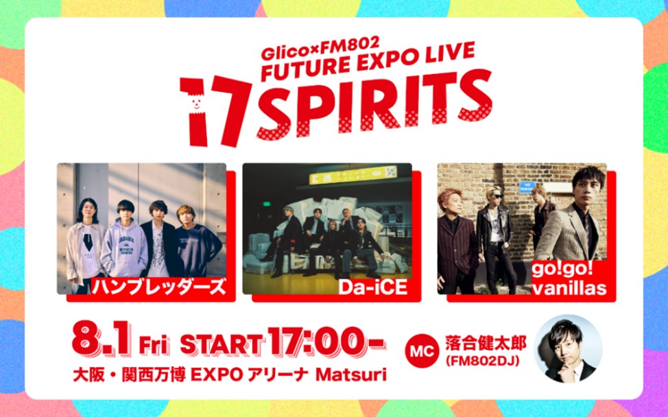 江崎グリコ株式会社は、大阪・関西万博のシグネチャーパビリオン シルバーパートナー/「大阪ヘルスケアパビリオン」プレミアムパートナーです。当社は 8 月 1 日(金)に大阪・関西万博会場内 EXPO アリーナ「Matsuri」にて、「セブンティーンアイス」の「大切な人たちと楽しい時間や空間を共有してほしい」という思いを込めた音楽イベント「17 SPIRITS」を開催します。出演アーティストは go!go!vanillas、Da-iCE、ハンブレッダーズの 3 組です。