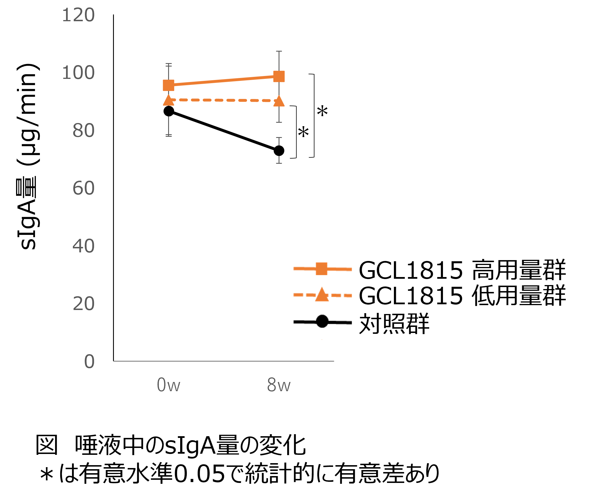 江崎グリコ株式会社は、健常成人を対象としたヒト試験において、当社独自の乳酸菌Lactobacillus helveticus GCL1815株(以下、GCL1815株)を継続摂取することで、唾液中の分泌型免疫グロブリンA(以下、sIgA)の産生が有意に促進され、風邪の幅広い自覚症状を抑えることを実証しました。