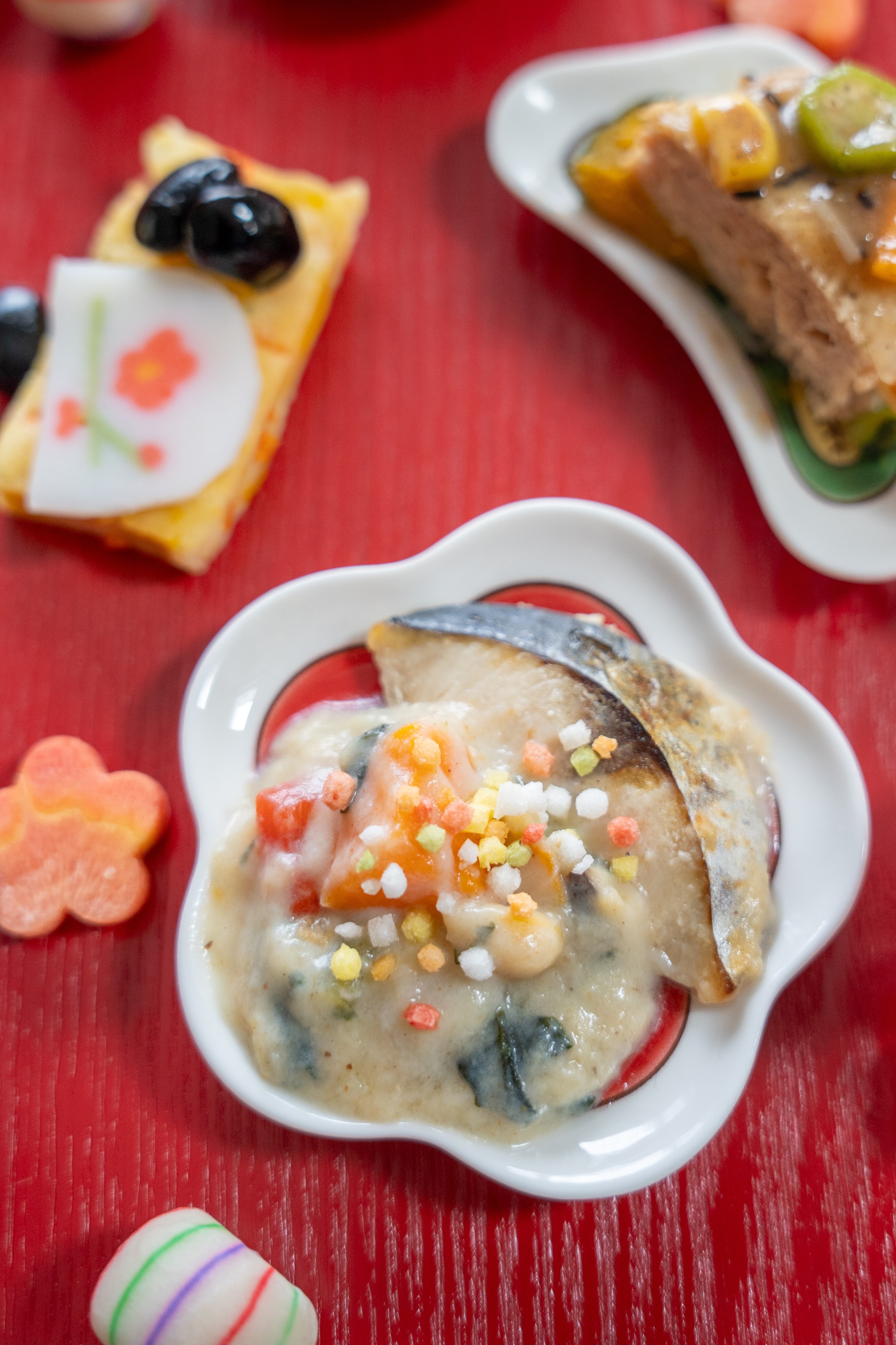 彩りかまぼこと黒豆、米粉のお食事パンケーキ