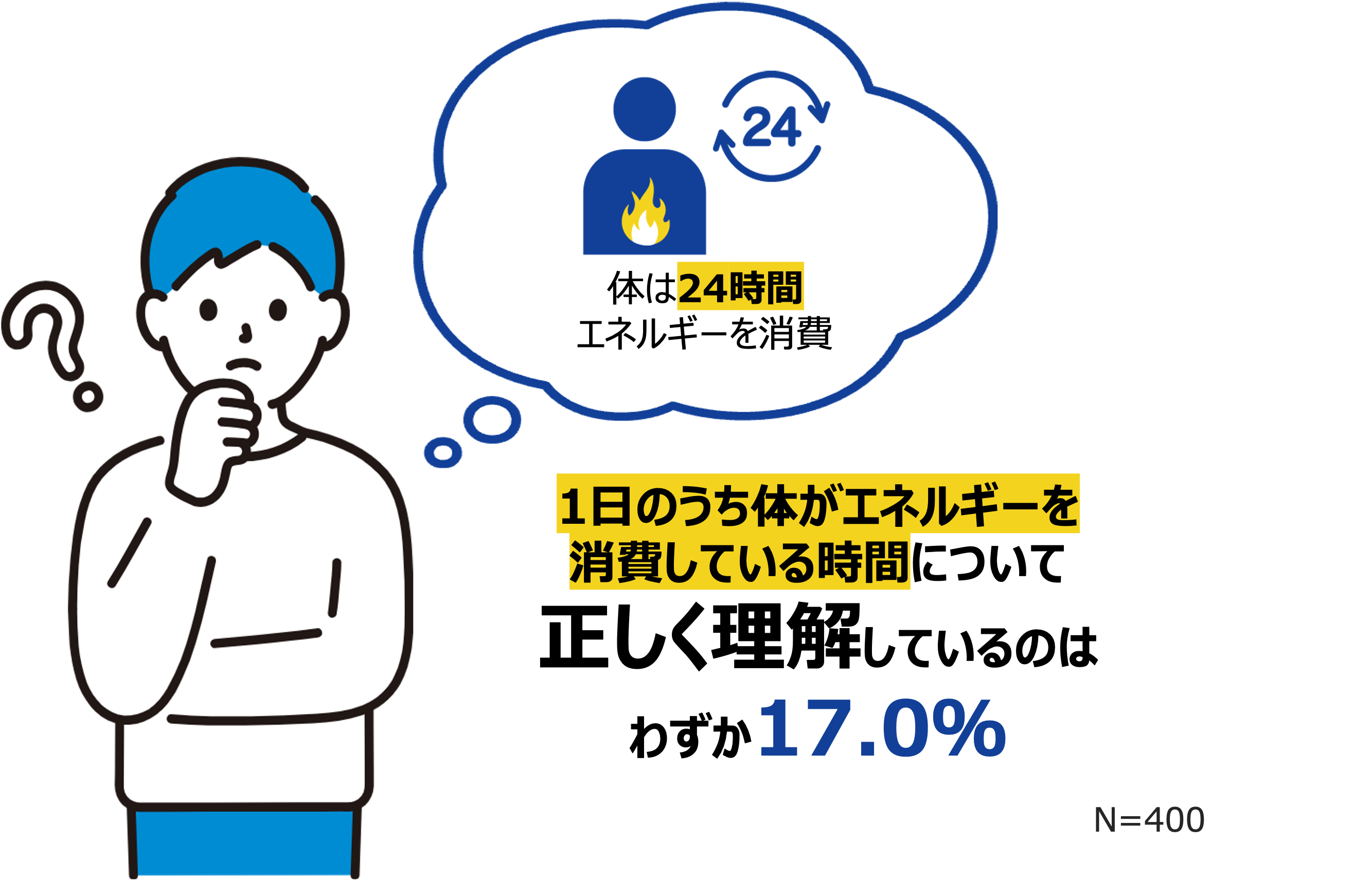 江崎グリコ株式会社は、3月4日の「世界肥満デー」を前に、働き世代の“動いていない時間(安静時)”の健康意識に関する調査を実施しました。調査の結果、体のエネルギー消費の理解度に関する質問では、「体が24時間エネルギーを消費している」と理解している人は17.0%という結果に。また、動いていない時間も消費される「安静時エネルギー消費」について知らない・理解していない人は約90%ということが明らかになりました。
