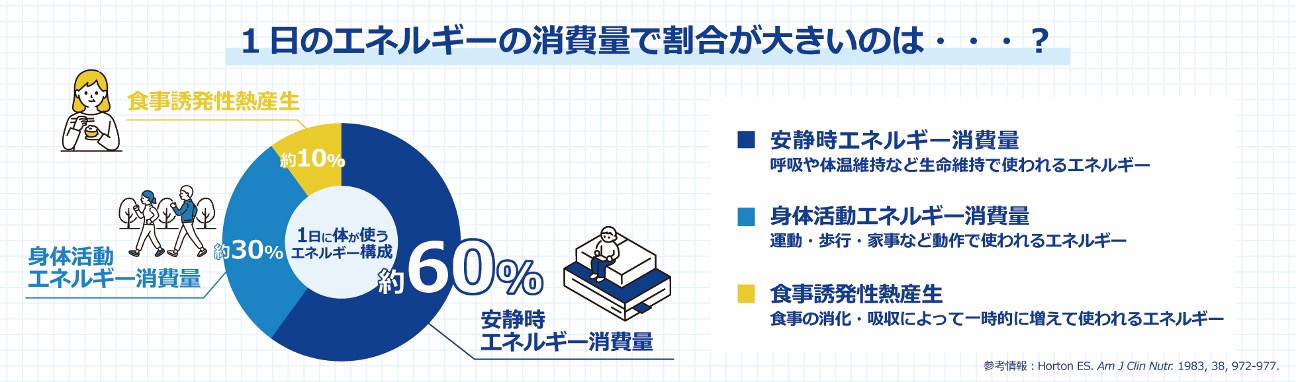 「安静時エネルギー消費」は、呼吸や内臓の働きなど、生命を維持するために常に消費されるエネルギーです。この「安静時エネルギー消費」は、1日に消費される総エネルギー量の約60%を占めるとされています。(※3)また、その量は年齢とともに低下すると言われています。今回の調査結果を受け、「安静時エネルギー消費」への関心を高めるとともに、その気づきを日々の生活に取り入れていただくことが、新しい健康のサポートにつながると考えます。