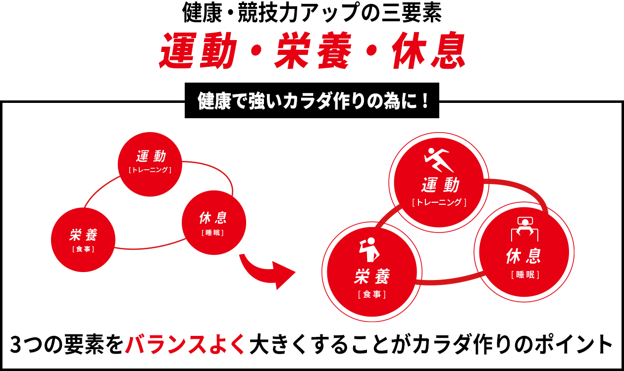 健康維持や競技力アップのための3要素として重要なのが「休息(睡眠)」「運動」「栄養」だ。3つの要素をバランスよく大きくすることがカラダづくりのポイント。成長期の高校生たちは体を大きく強くしたいという強い気持ちからつい筋肉トレーニングなどで負荷を高めがちだが、大事なのは「休息(睡眠)」「栄養」もしっかりと取り組むこと。今日はこの2つの要素を重点的にお話していく。