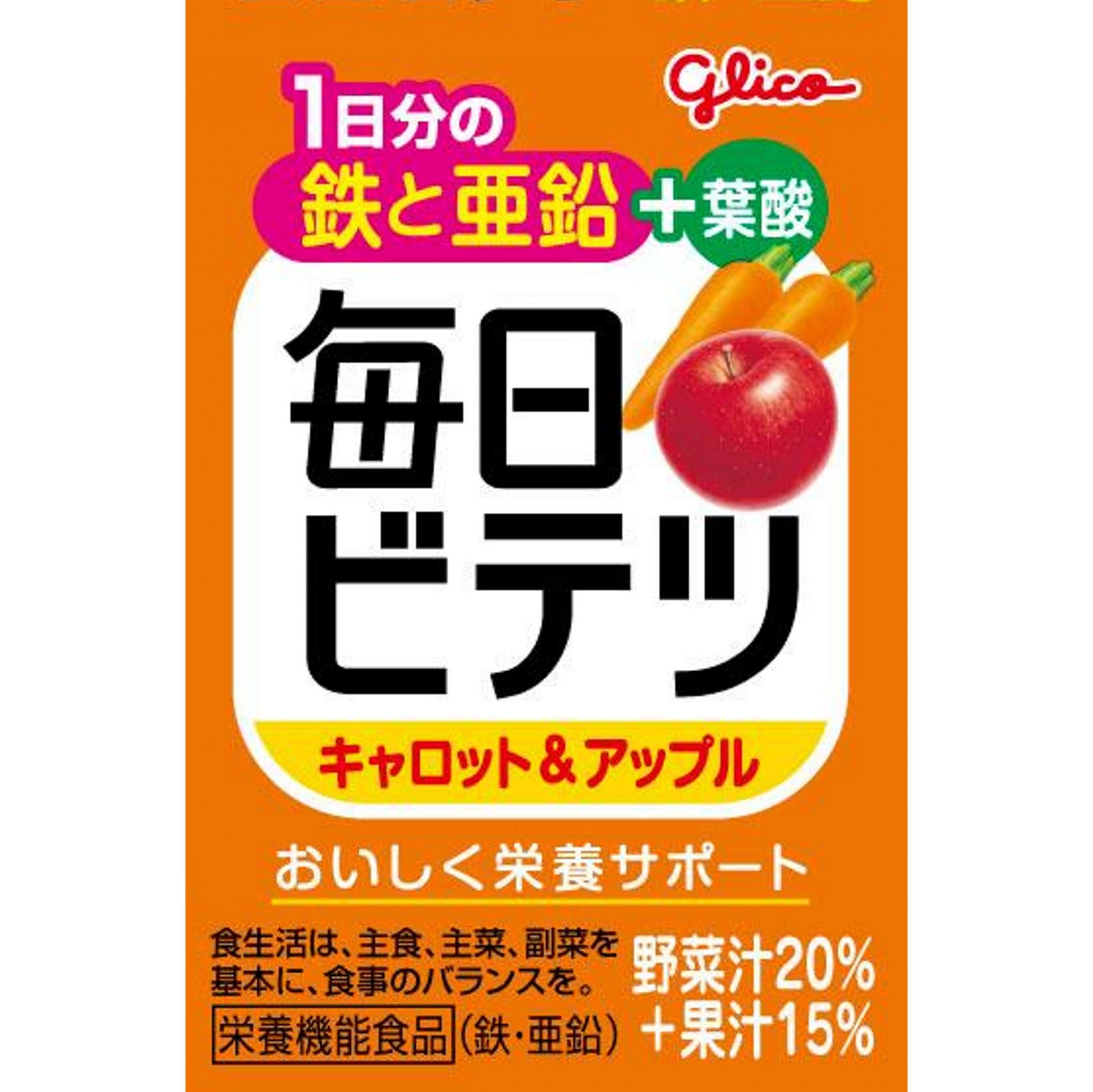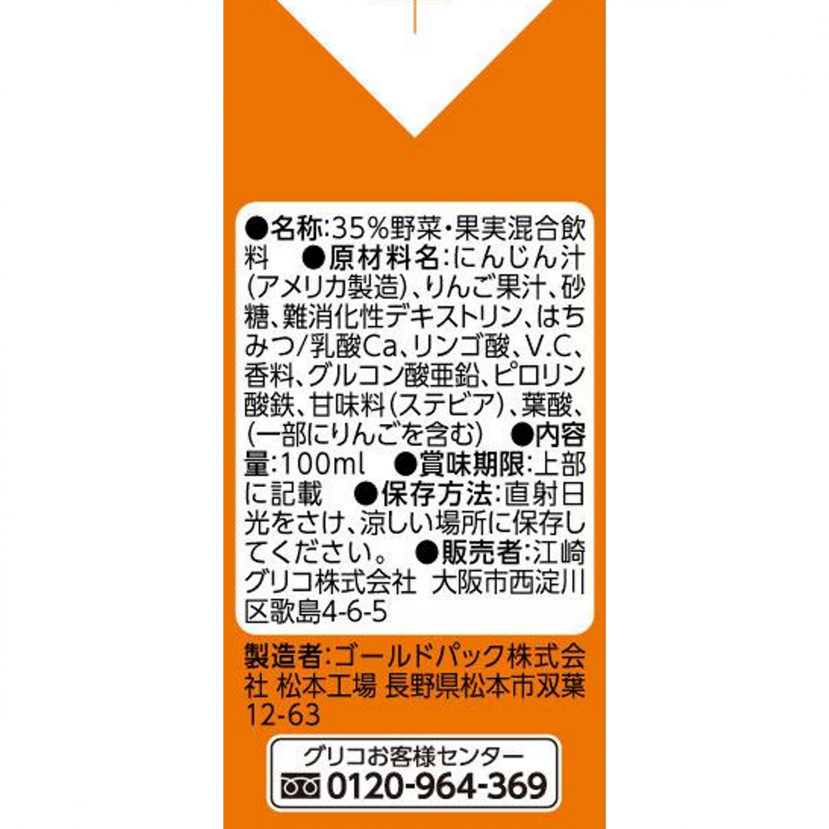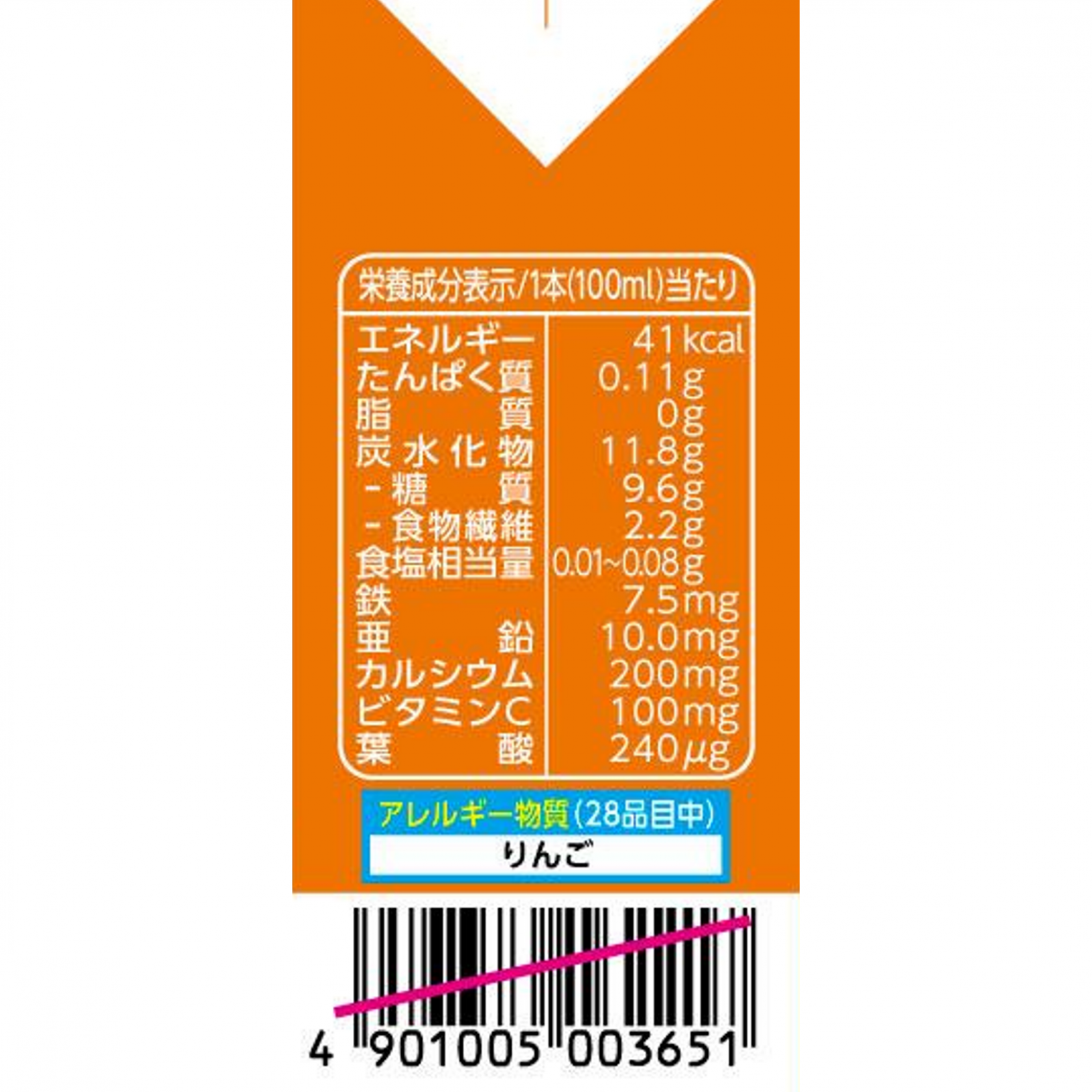 にんじん汁(アメリカ製造)、りんご果汁、砂糖、難消化性デキストリン、はちみつ/乳酸Ca、リンゴ酸、V.C、香料、グルコン酸亜鉛、ピロリン酸鉄、甘味料(ステビア)、葉酸、(一部にりんごを含む)