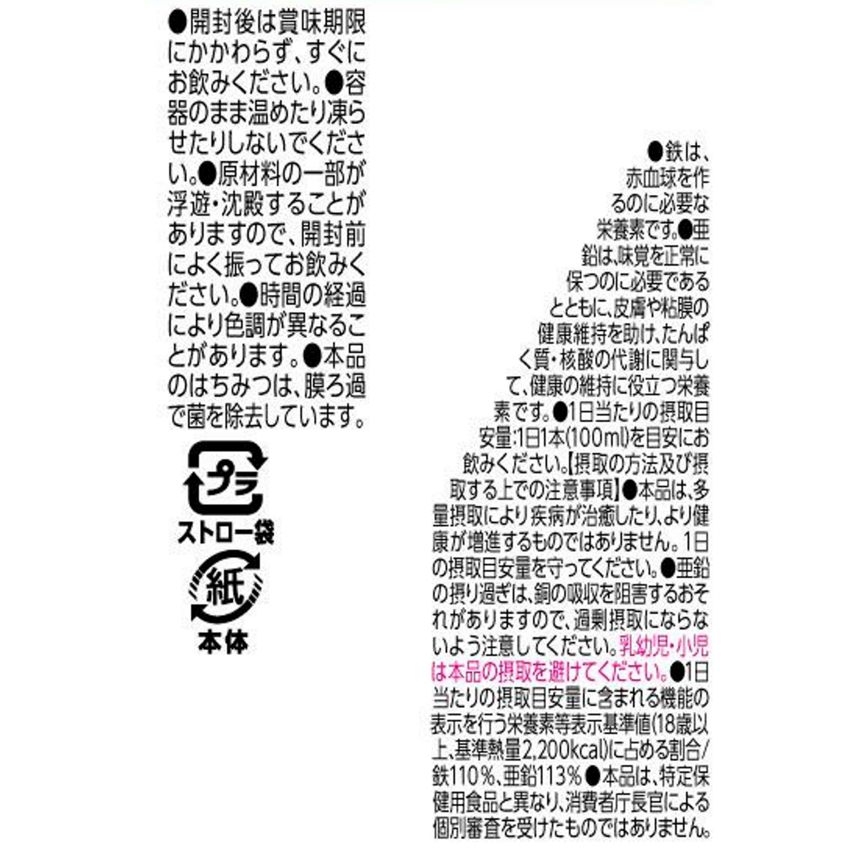 見出し(表示されません) 見出し(表示されません) エネルギー 41kcal たんぱく質 0.11g 脂質 0g 炭水化物 11.8g -糖質 9.6g -食物繊維 2.2g 食塩相当量 0.01~0.08g 鉄 7.5mg 亜鉛 10.0mg カルシウム 200mg ビタミンC 100mg 葉酸 240μg 参考値 1本(100ml)当たり
