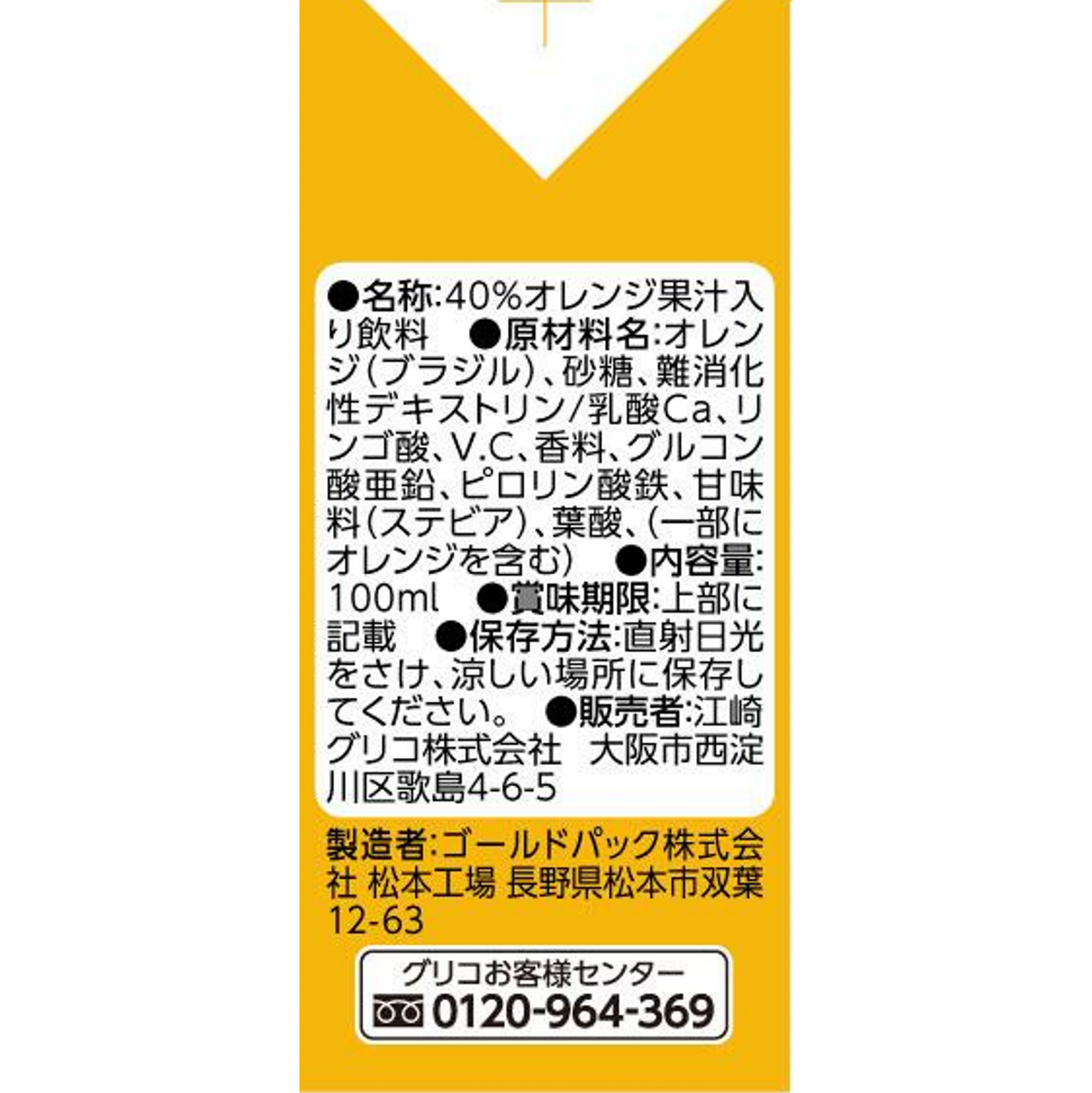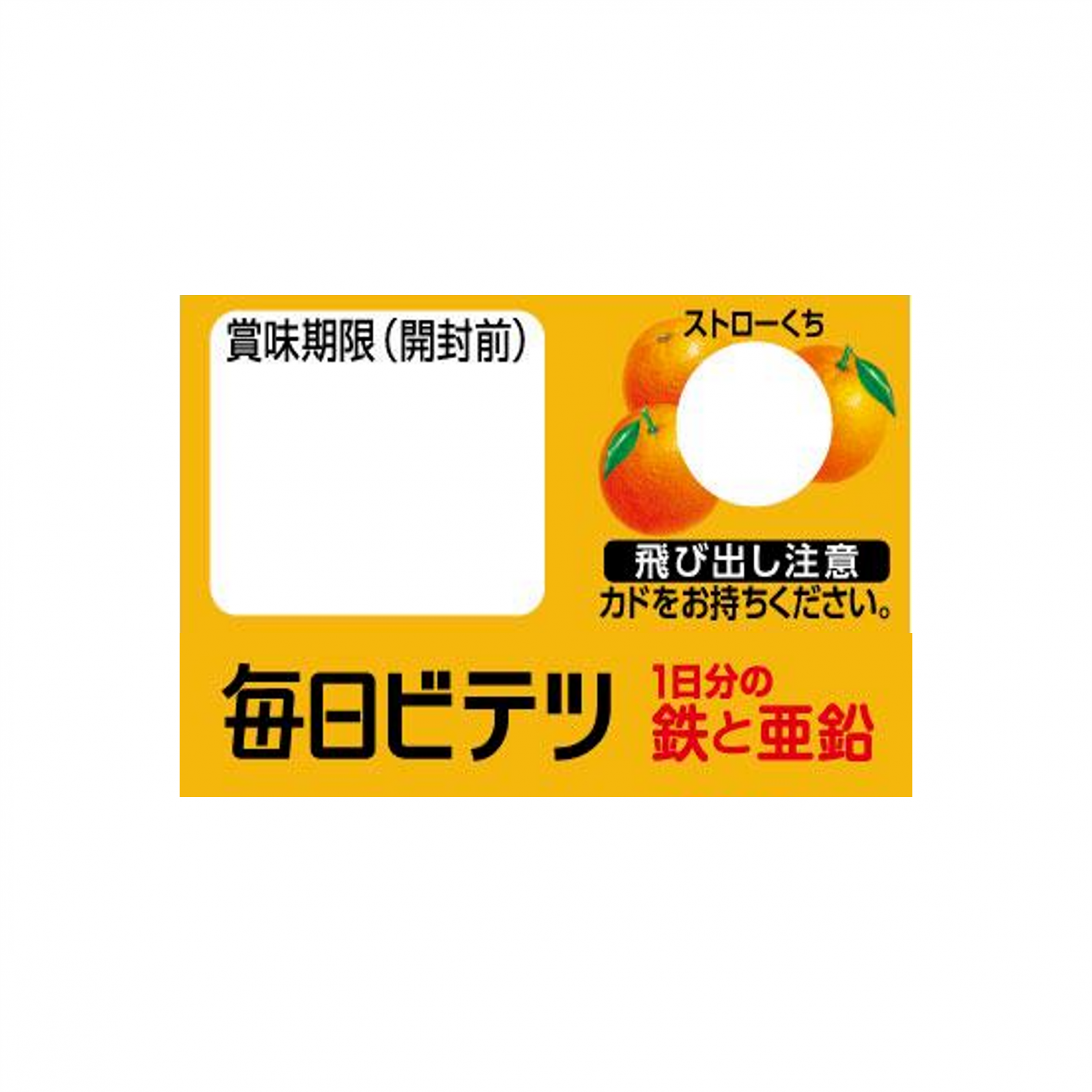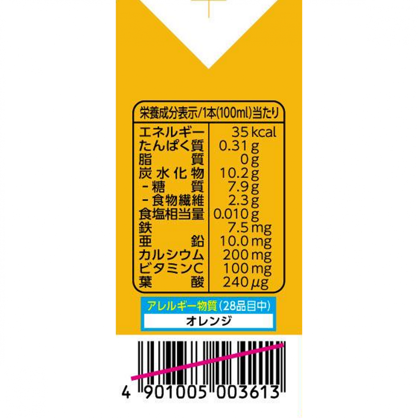 オレンジ(ブラジル)、砂糖、難消化性デキストリン/乳酸Ca、リンゴ酸、V.C、香料、グルコン酸亜鉛、ピロリン酸鉄、甘味料(ステビア)、葉酸、(一部にオレンジを含む)