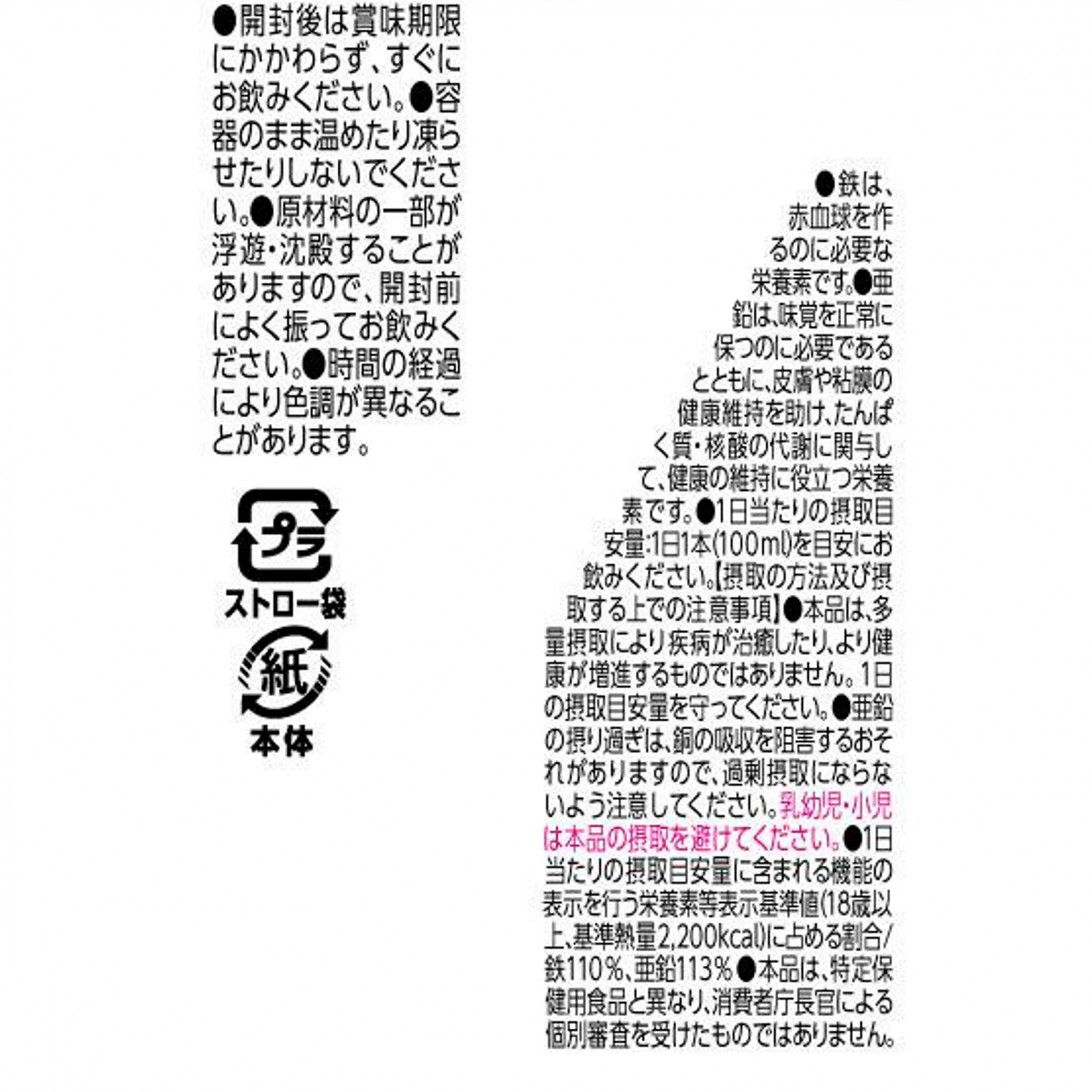 見出し(表示されません) 見出し(表示されません) エネルギー 35kcal たんぱく質 0.31g 脂質 0g 炭水化物 10.2g -糖質 7.9g -食物繊維 2.3g 食塩相当量 0.010g 鉄 7.5mg 亜鉛 10.0mg カルシウム 200mg ビタミンC 100mg 葉酸 240μg 参考値 1本(100ml)当たり
