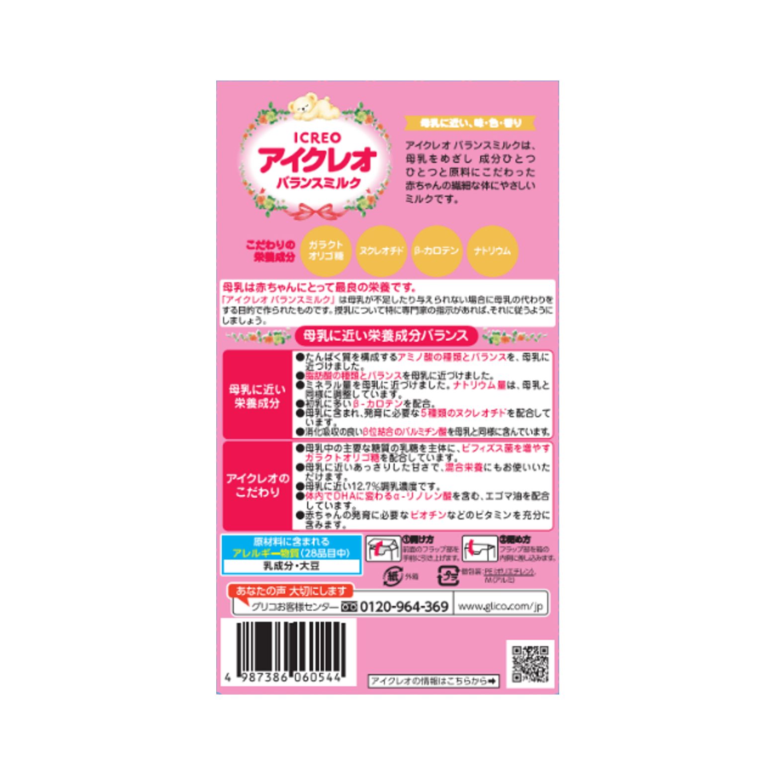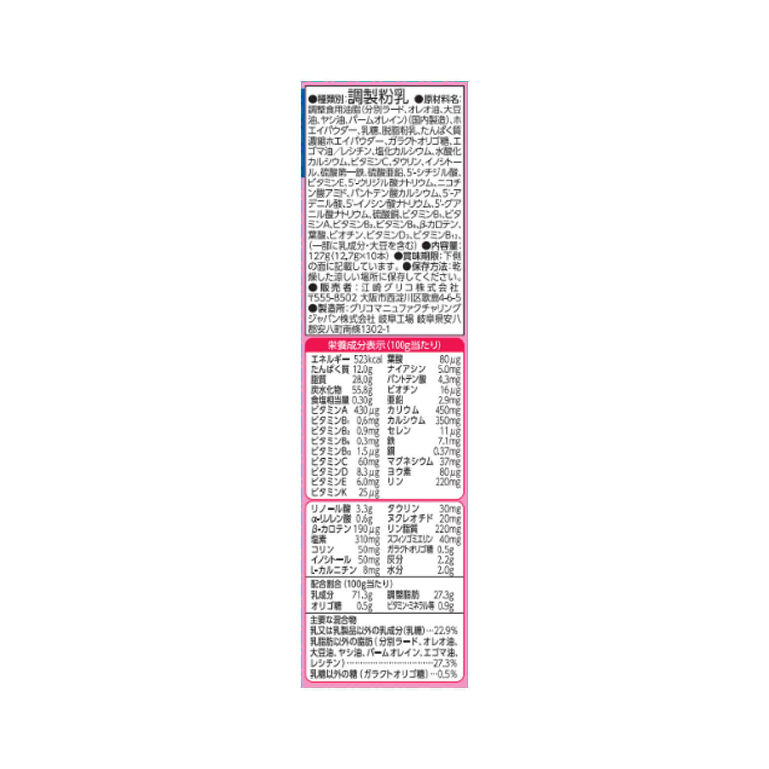 調整食用油脂(分別ラード、オレオ油、大豆油、ヤシ油、パームオレイン)(国内製造)、ホエイパウダー、乳糖、脱脂粉乳、たんぱく質濃縮ホエイパウダー、ガラクトオリゴ糖、エゴマ油/レシチン、塩化カルシウム、水酸化カルシウム、ビタミンC、タウリン、イノシトール、硫酸第一鉄、硫酸亜鉛、5'-シチジル酸、ビタミンE、5'-ウリジル酸ナトリウム、ニコチン酸アミド、パントテン酸カルシウム、5'-アデニル酸、5'-イノシン酸ナトリウム、5'-グアニル酸ナトリウム、硫酸銅、ビタミンB1、ビタミンA、ビタミンB2、ビタミンB6、β-カロテン、葉酸、ビオチン、ビタミンD3、ビタミンB12、(一部に乳成分・大豆を含む)