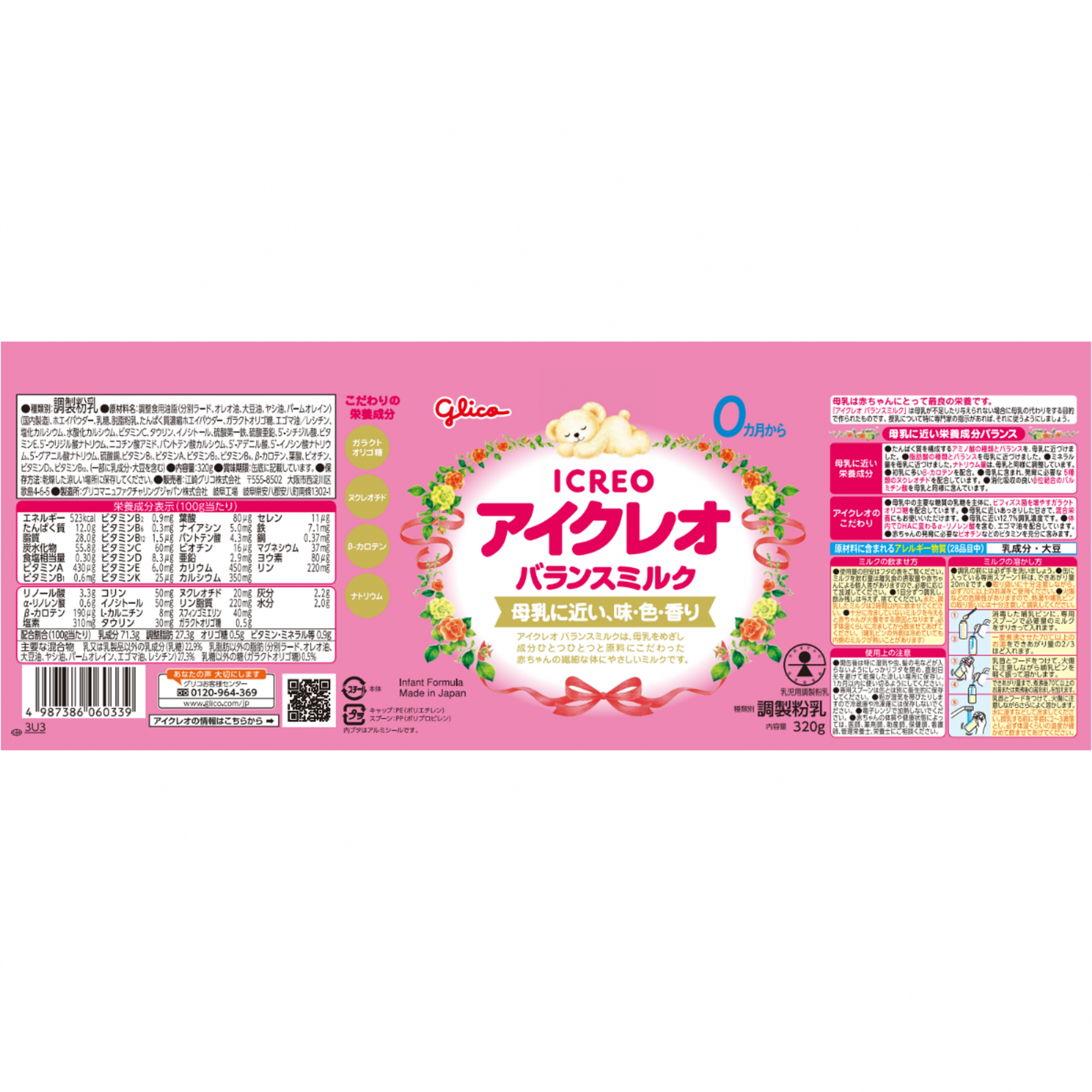 調整食用油脂(分別ラード、オレオ油、大豆油、ヤシ油、パームオレイン)(国内製造)、ホエイパウダー、乳糖、脱脂粉乳、たんぱく質濃縮ホエイパウダー、ガラクトオリゴ糖、エゴマ油/レシチン、塩化カルシウム、水酸化カルシウム、ビタミンC、タウリン、イノシトール、硫酸第一鉄、硫酸亜鉛、5'-シチジル酸、ビタミンE、5'-ウリジル酸ナトリウム、ニコチン酸アミド、パントテン酸カルシウム、5'-アデニル酸、5'-イノシン酸ナトリウム、5'-グアニル酸ナトリウム、硫酸銅、ビタミンB1、ビタミンA、ビタミンB2、ビタミンB6、β-カロテン、葉酸、ビオチン、ビタミンD3、ビタミンB12、(一部に乳成分・大豆を含む)