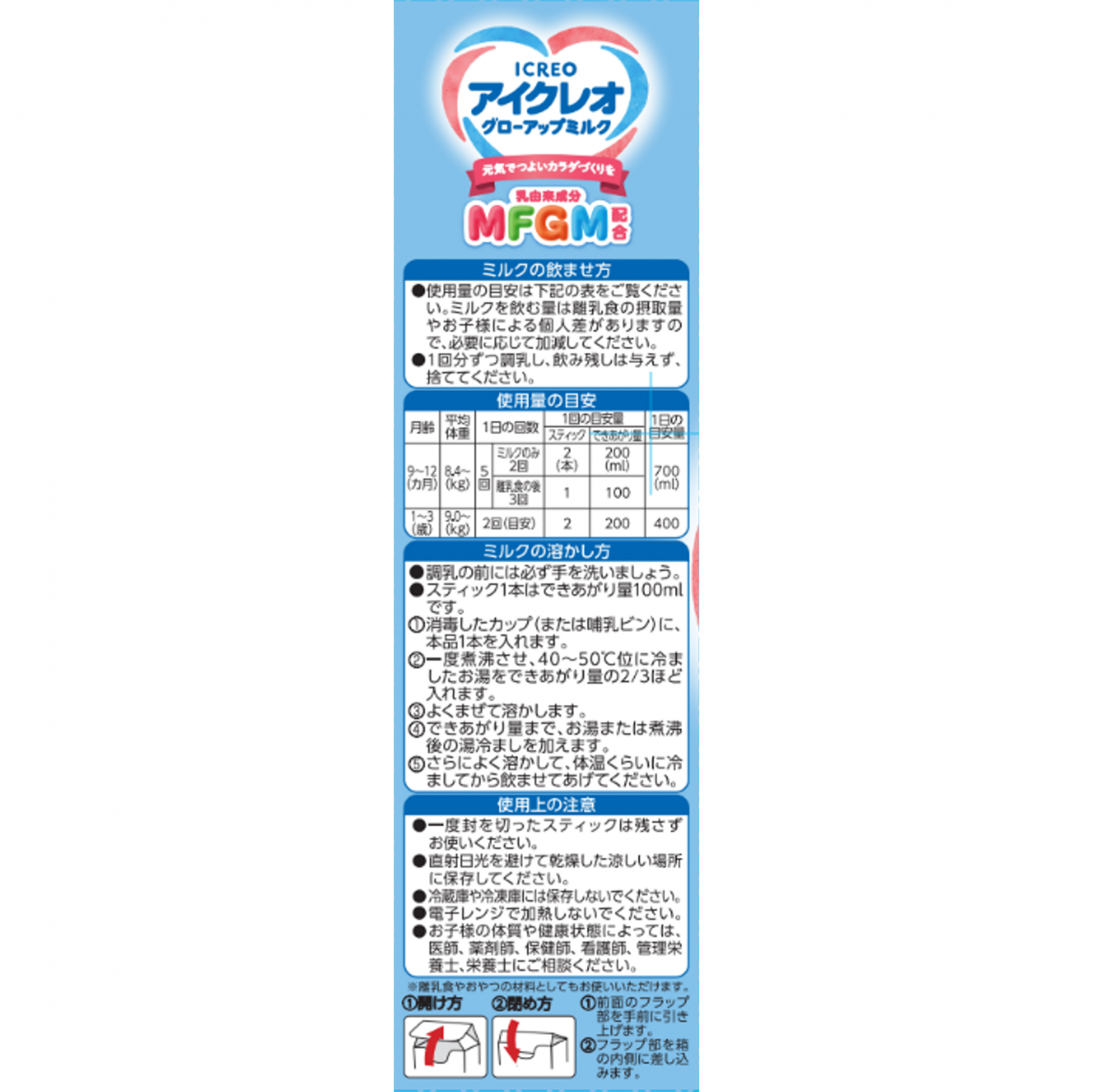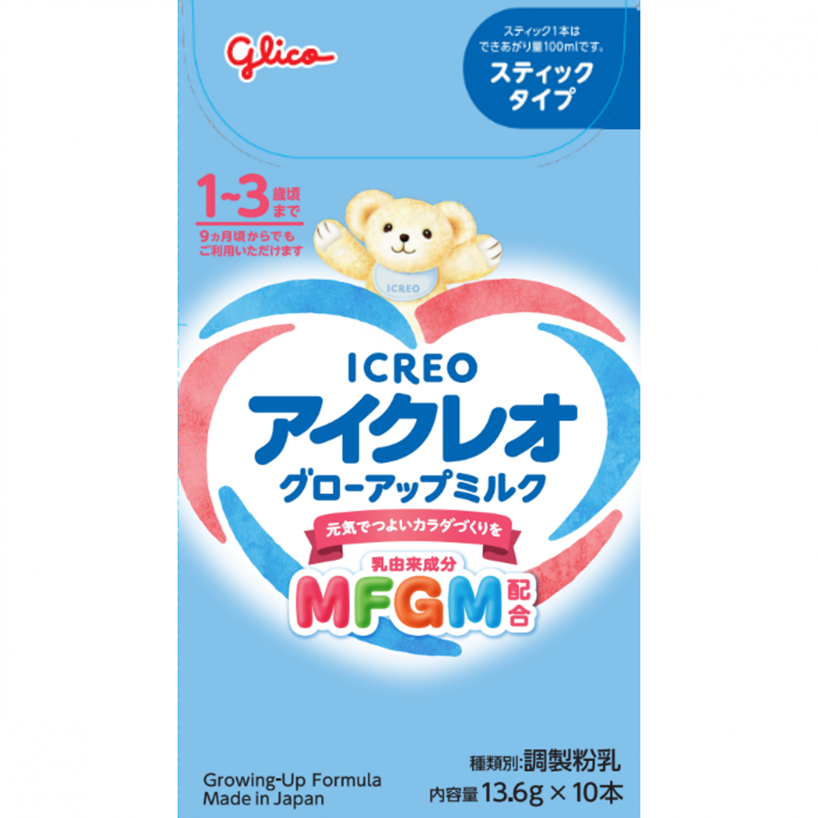 お子様に必要な栄養素を補うだけでなく、すこやかな発育をサポートするために乳由来成分であるMFGM(Milk Fat Globule Membrane; 乳脂肪球皮膜)を配合。卒乳後の元気なカラダづくりを応援するために開発された粉ミルク、それが「アイクレオ グローアップミルク」です。持ち運びにも便利なスティックタイプです。