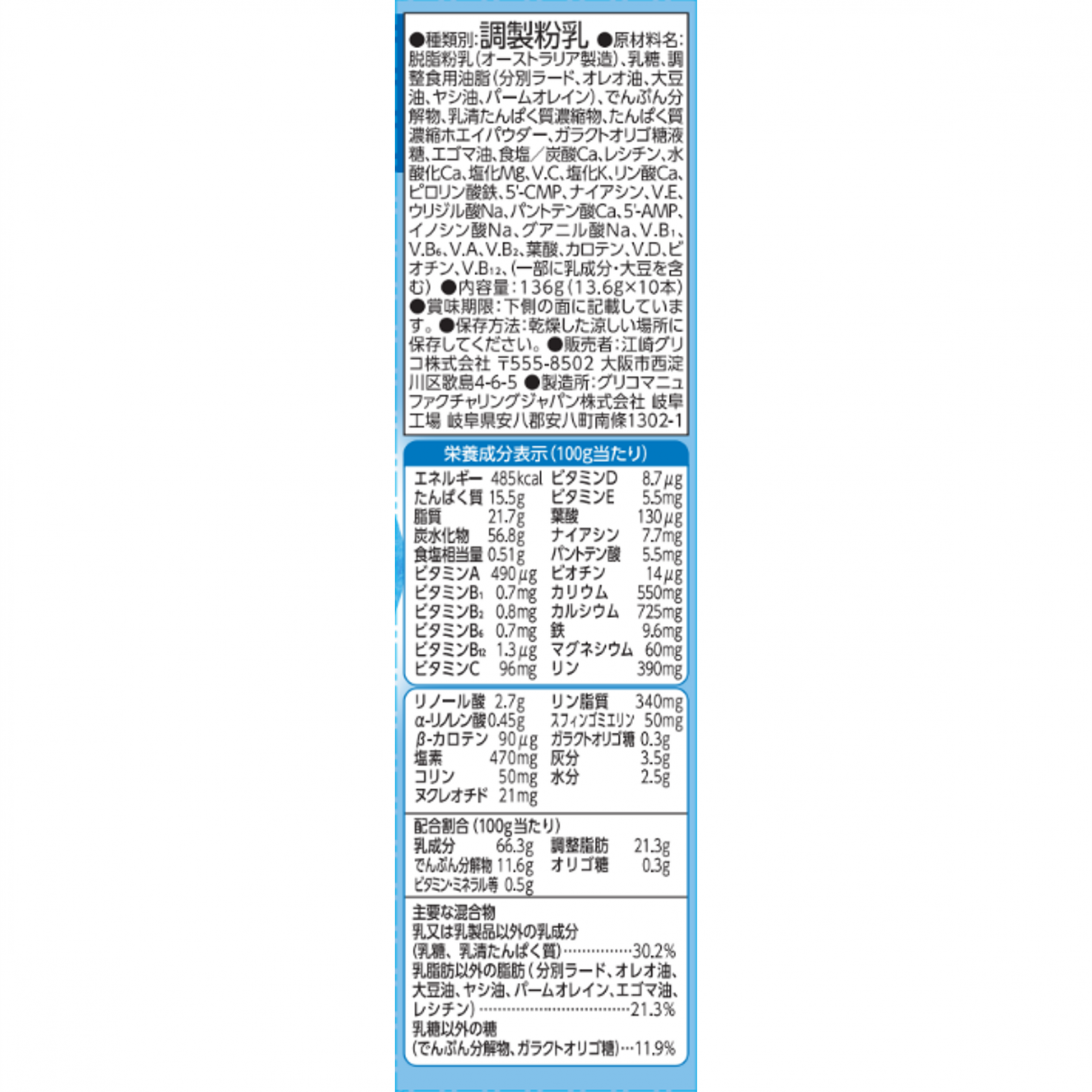 脱脂粉乳(オーストラリア製造)、乳糖、調整食用油脂(分別ラード、オレオ油、大豆油、ヤシ油、パームオレイン)、でんぷん分解物、乳清たんぱく質濃縮物、たんぱく質濃縮ホエイパウダー、ガラクトオリゴ糖液糖、エゴマ油、食塩/炭酸Ca、レシチン、水酸化Ca、塩化Mg、V.C、塩化K、リン酸Ca、ピロリン酸鉄、5'-CMP、ナイアシン、V.E、ウリジル酸Na、パントテン酸Ca、5'-AMP、イノシン酸Na、グアニル酸Na、V.B1、V.B6、V.A、V.B2、葉酸、カロテン、V.D、ビオチン、V.B12、(一部に乳成分・大豆を含む)