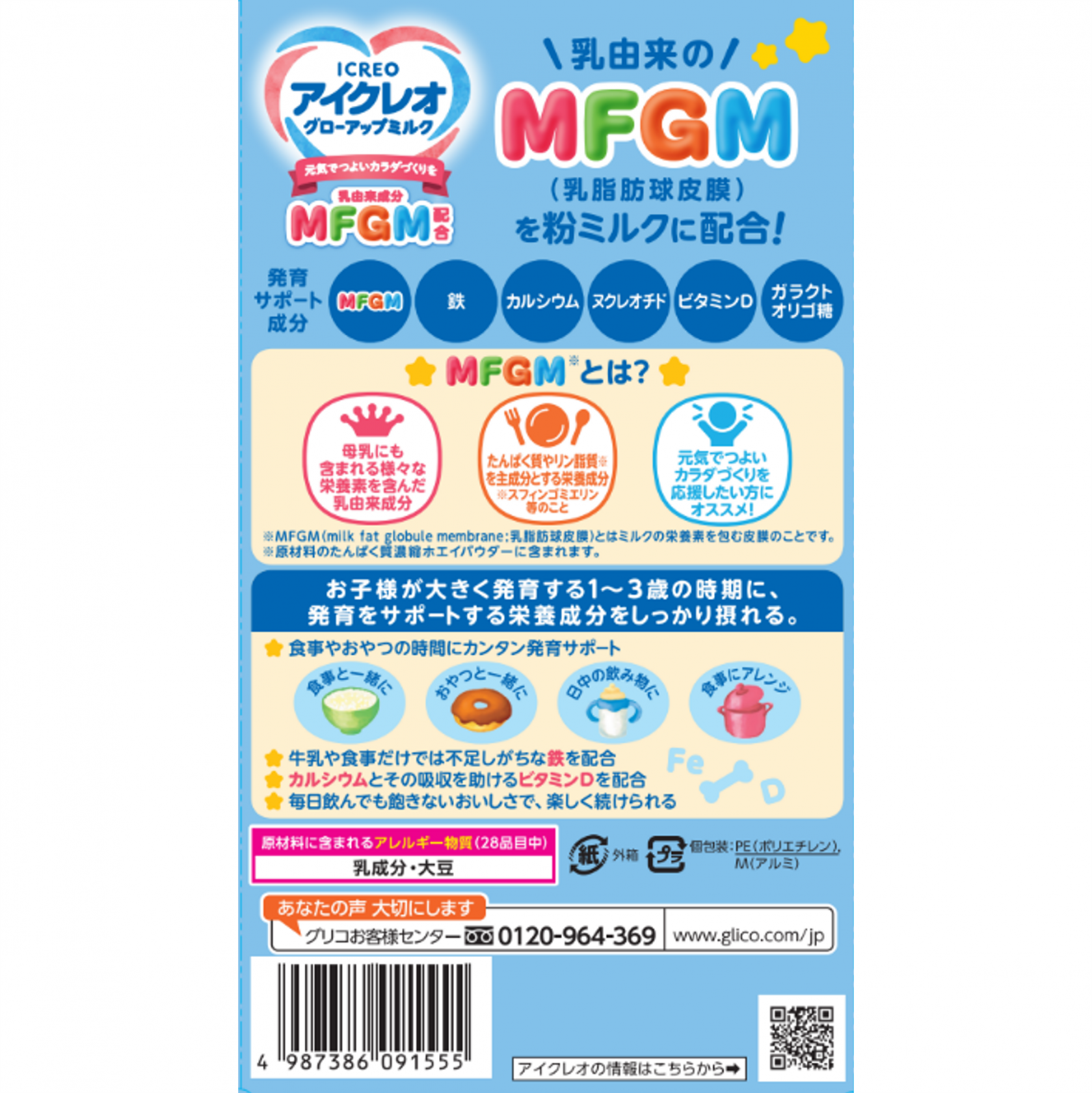 お子様に必要な栄養素を補うだけでなく、すこやかな発育をサポートするために乳由来成分であるMFGM(Milk Fat Globule Membrane; 乳脂肪球皮膜)を配合。卒乳後の元気なカラダづくりを応援するために開発された粉ミルク、それが「アイクレオ グローアップミルク」です。持ち運びにも便利なスティックタイプです。