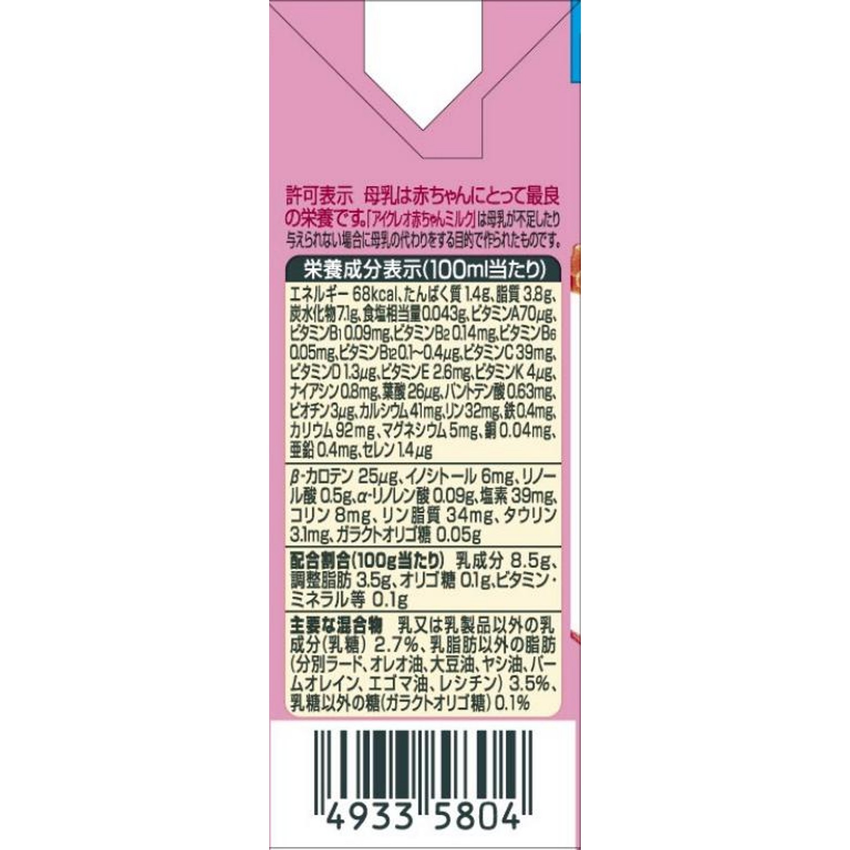 見出し(表示されません) 見出し(表示されません) β-カロテン 25μg イノシトール 6mg リノール酸 0.5g α-リノレン酸 0.09g 塩素 39mg コリン 8mg リン脂質 34mg タウリン 3.1mg ガラクトオリゴ糖 0.05g
