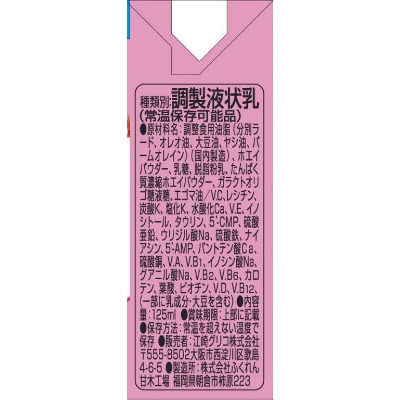 調整食用油脂(分別ラード、オレオ油、大豆油、ヤシ油、パームオレイン)(国内製造)、ホエイパウダー、乳糖、脱脂粉乳、たんぱく質濃縮ホエイパウダー、ガラクトオリゴ糖液糖、エゴマ油/V.C、レシチン、炭酸K、塩化K、水酸化Ca、V.E、イノシトール、タウリン、5’-CMP、硫酸亜鉛、ウリジル酸Na、硫酸鉄、ナイアシン、5’-AMP、パントテン酸Ca、硫酸銅、V.A、V.B1、イノシン酸Na、グアニル酸Na、V.B2、V.B6、カロテン、葉酸、ビオチン、V.D、V.B12、(一部に乳成分・大豆を含む)
