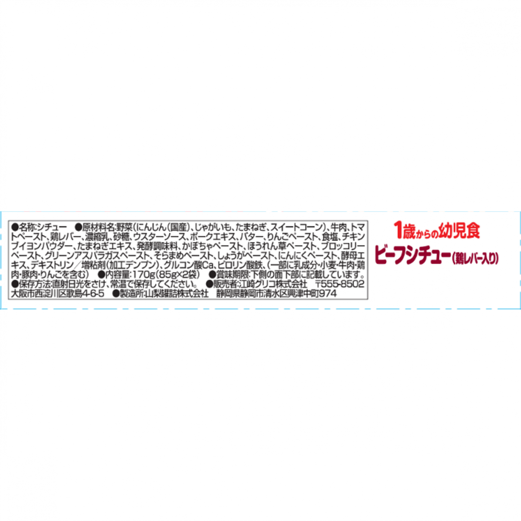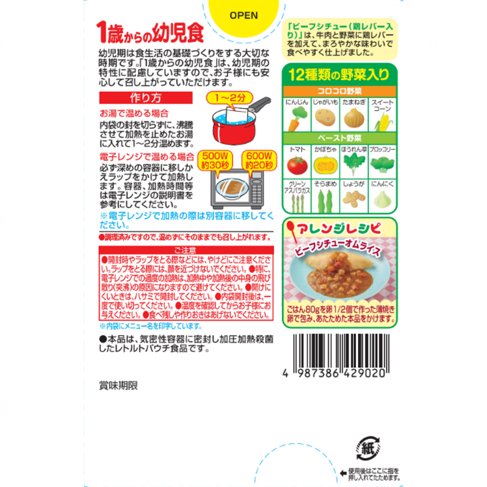 野菜(にんじん(国産)、じゃがいも、たまねぎ、スイートコーン)、牛肉、トマトペースト、鶏レバー、濃縮乳、砂糖、ウスターソース、ポークエキス、バター、りんごペースト、食塩、チキンブイヨンパウダー、たまねぎエキス、発酵調味料、かぼちゃペースト、ほうれん草ペースト、ブロッコリーペースト、グリーンアスパラガスペースト、そらまめペースト、しょうがペースト、にんにくペースト、酵母エキス、デキストリン/増粘剤(加工デンプン)、グルコン酸Ca、ピロリン酸鉄、(一部に乳成分・小麦・牛肉・鶏肉・豚肉・りんごを含む)