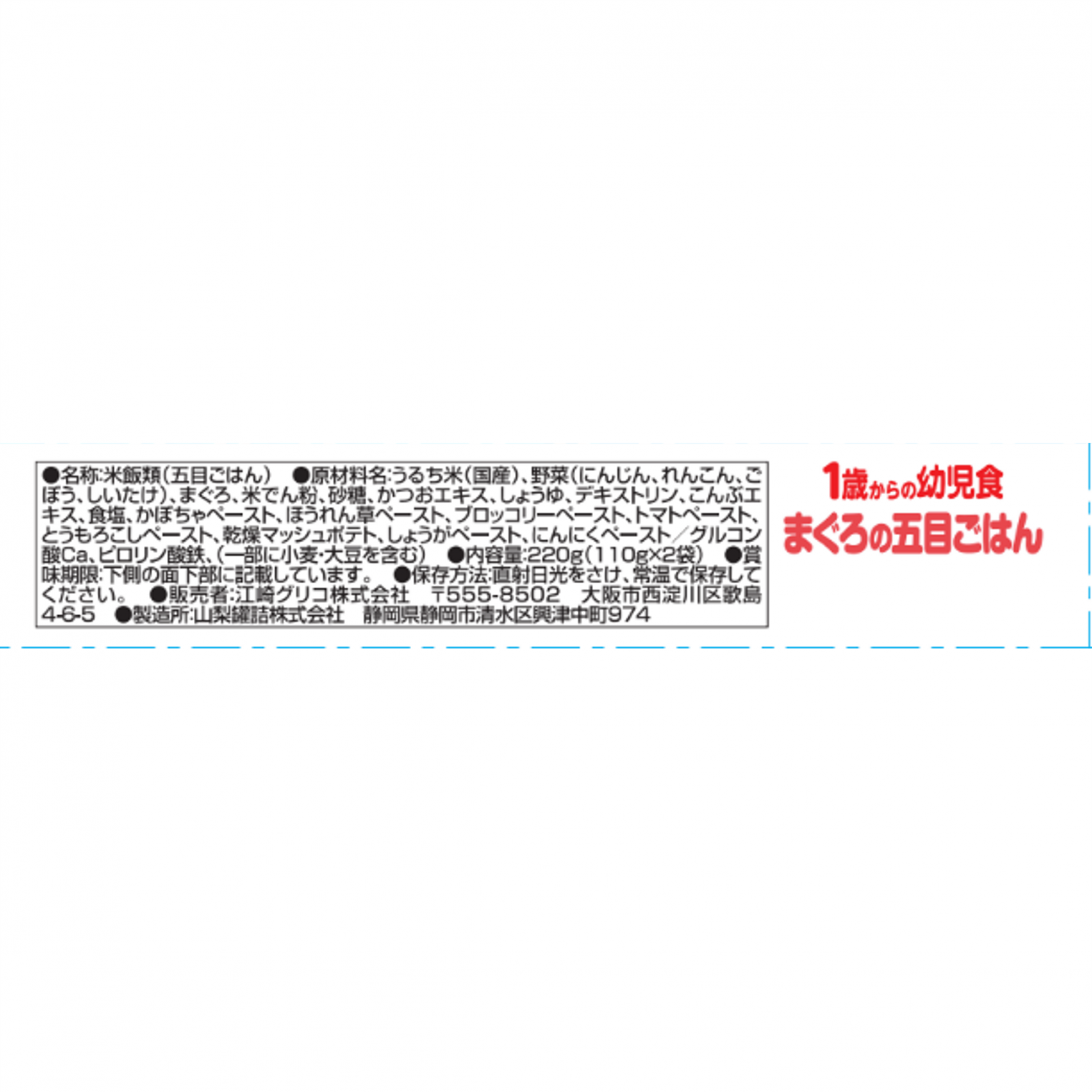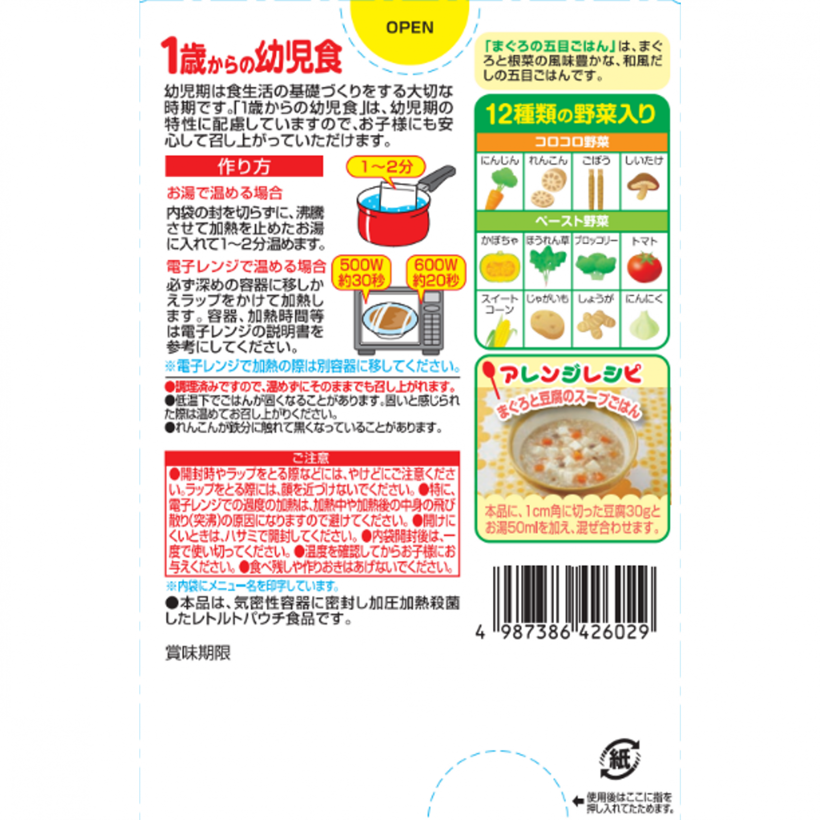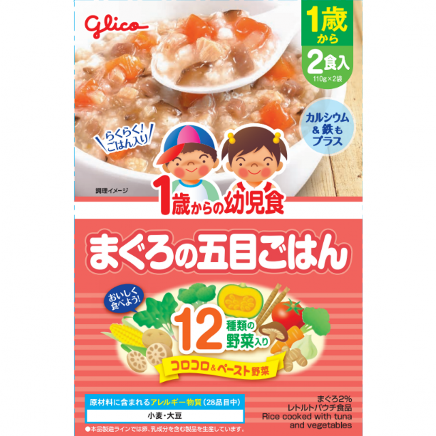 うるち米(国産)、野菜(にんじん、れんこん、ごぼう、しいたけ)、まぐろ、米でん粉、砂糖、かつおエキス、しょうゆ、デキストリン、こんぶエキス、食塩、かぼちゃペースト、ほうれん草ペースト、ブロッコリーペースト、トマトペースト、とうもろこしペースト、乾燥マッシュポテト、しょうがペースト、にんにくペースト/グルコン酸Ca、ピロリン酸鉄、(一部に小麦・大豆を含む)