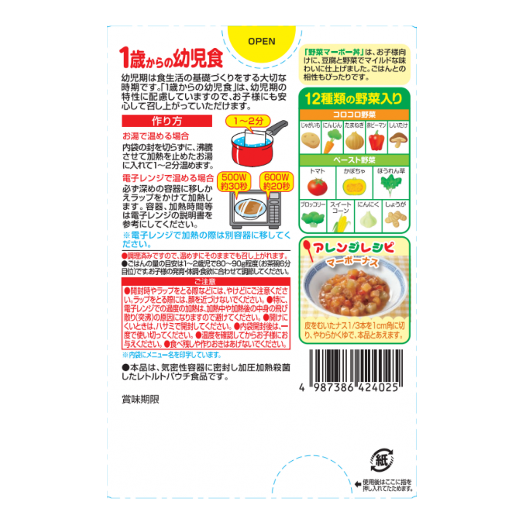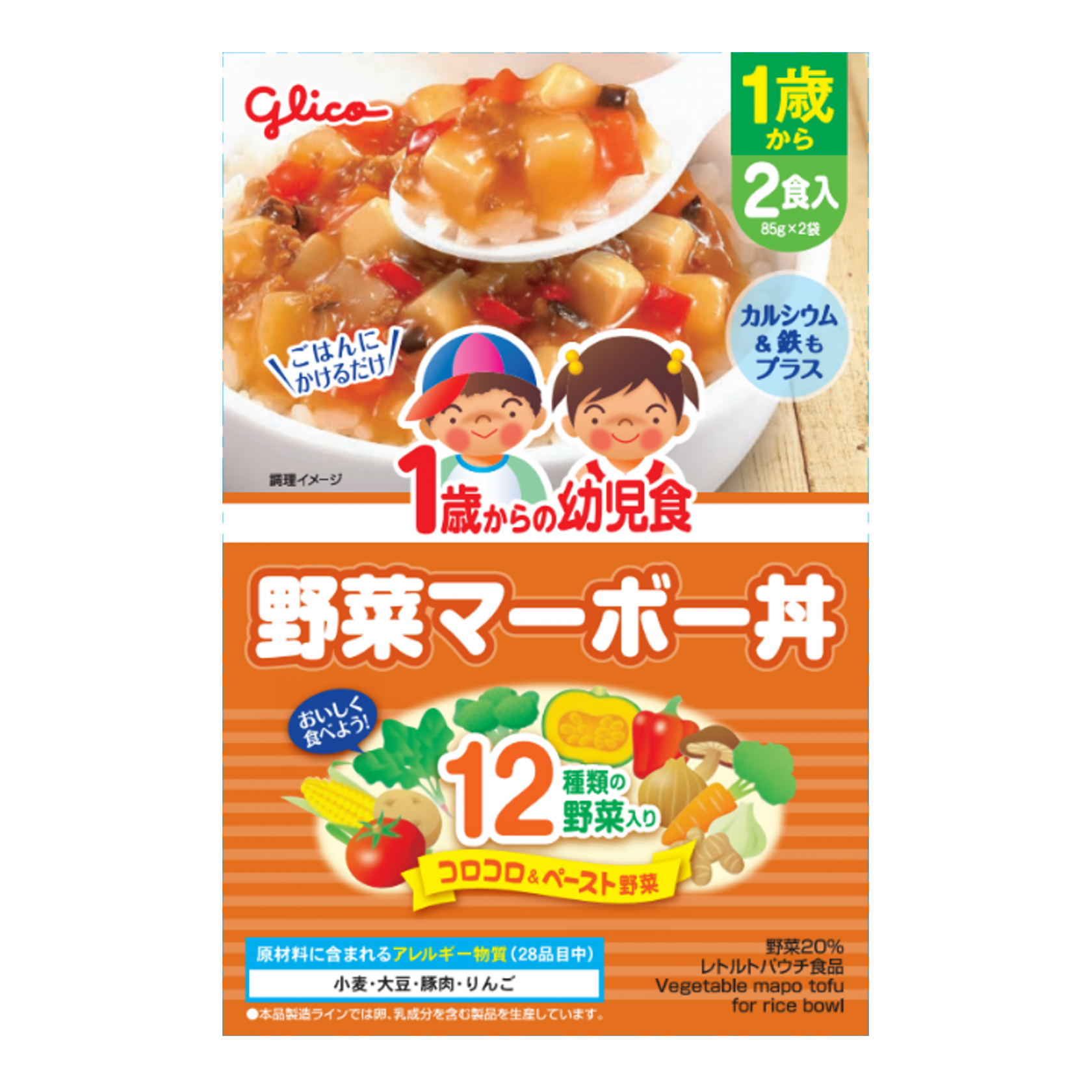 野菜(じゃがいも、にんじん、たまねぎ、赤ピーマン、しいたけ)、豆腐(国内製造)、豚肉、しょうゆ、砂糖、トマトペースト、りんごペースト、ごま油、水あめ、オイスターソース、みそ、かぼちゃペースト、ほうれん草ペースト、ブロッコリーペースト、とうもろこしペースト、にんにくペースト、しょうがペースト/増粘剤(加工デンプン)、グルコン酸Ca、豆腐用凝固剤、ピロリン酸鉄、(一部に小麦・大豆・豚肉・りんごを含む)