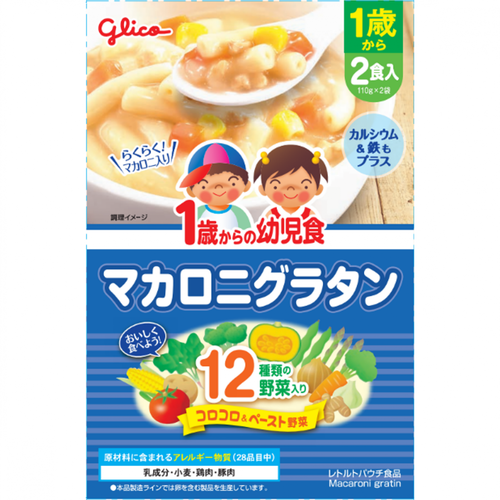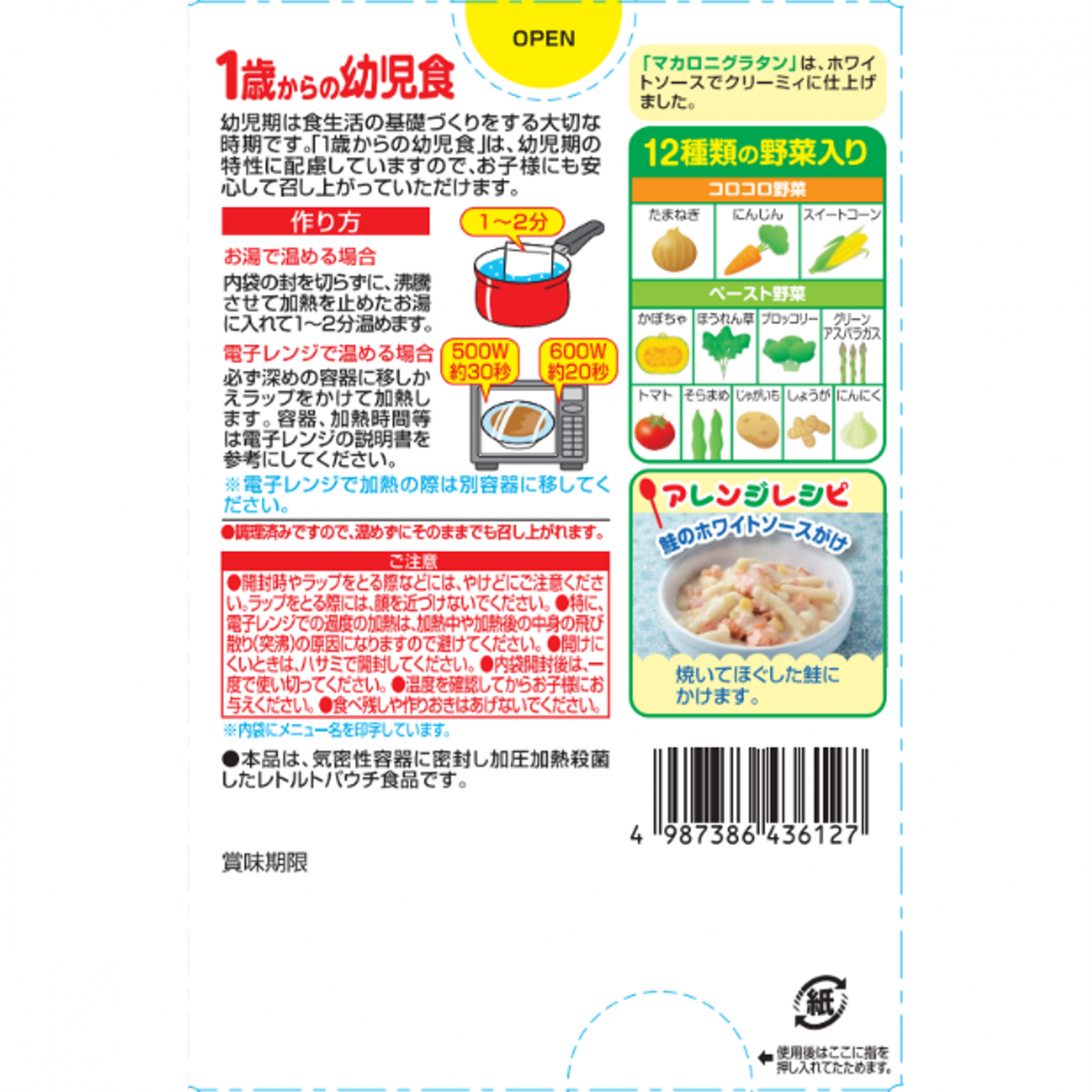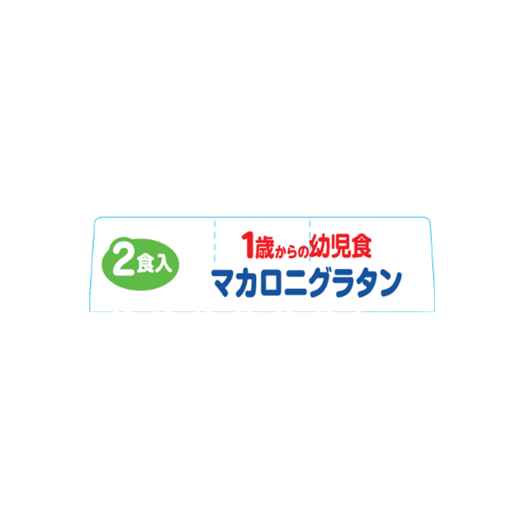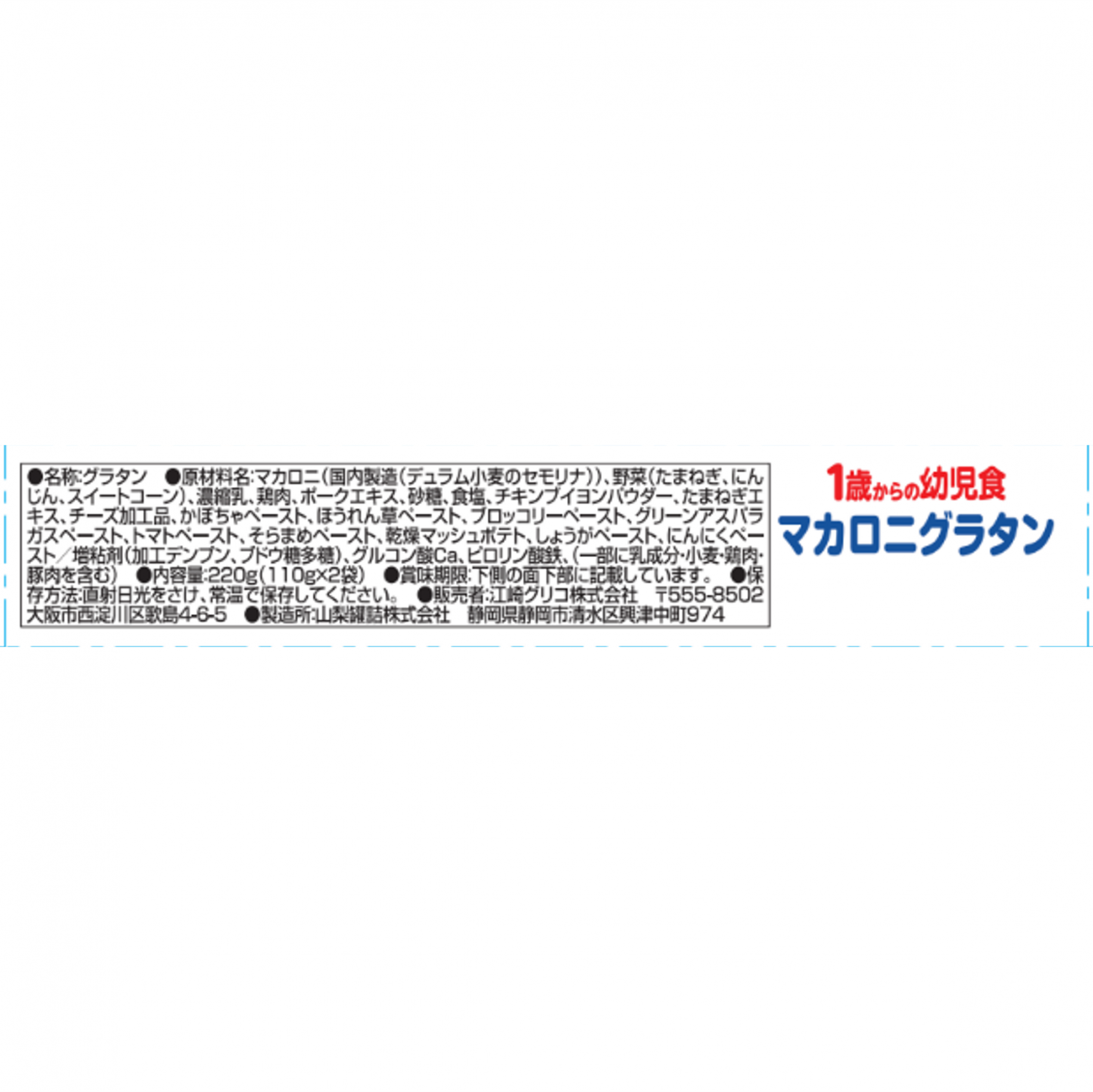 マカロニ(国内製造(デュラム小麦のセモリナ))、野菜(たまねぎ、にんじん、スイートコーン)、濃縮乳、鶏肉、ポークエキス、砂糖、食塩、チキンブイヨンパウダー、たまねぎエキス、チーズ加工品、かぼちゃペースト、ほうれん草ペースト、ブロッコリーペースト、グリーンアスパラガスペースト、トマトペースト、そらまめペースト、乾燥マッシュポテト、しょうがペースト、にんにくペースト/増粘剤(加工デンプン、ブドウ糖多糖)、グルコン酸Ca、ピロリン酸鉄、(一部に乳成分・小麦・鶏肉・豚肉を含む)
