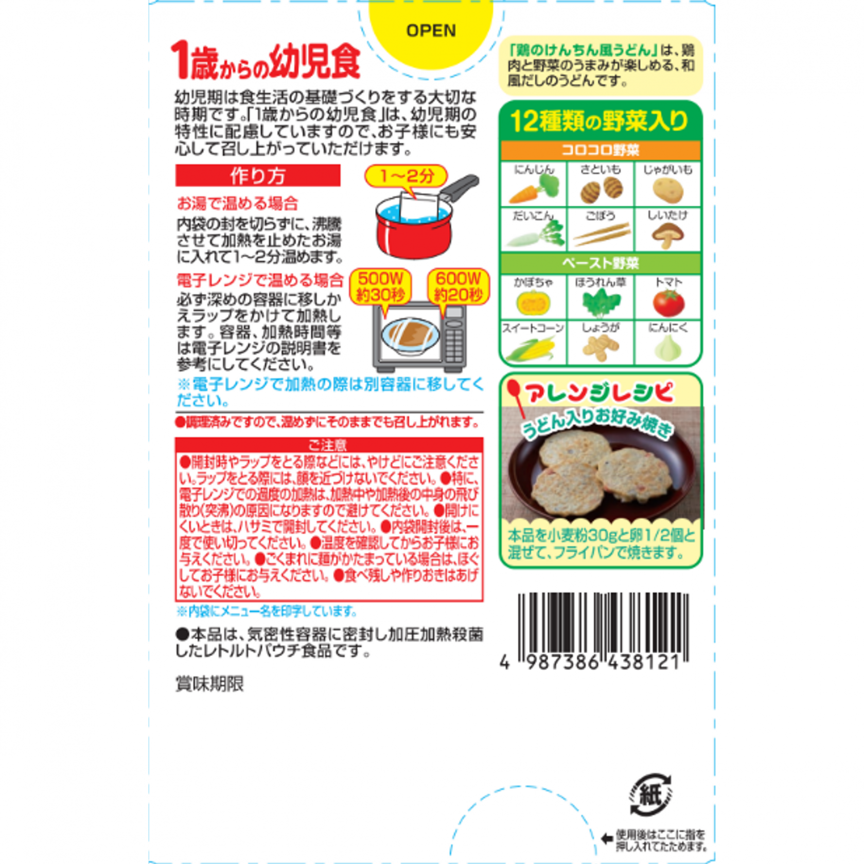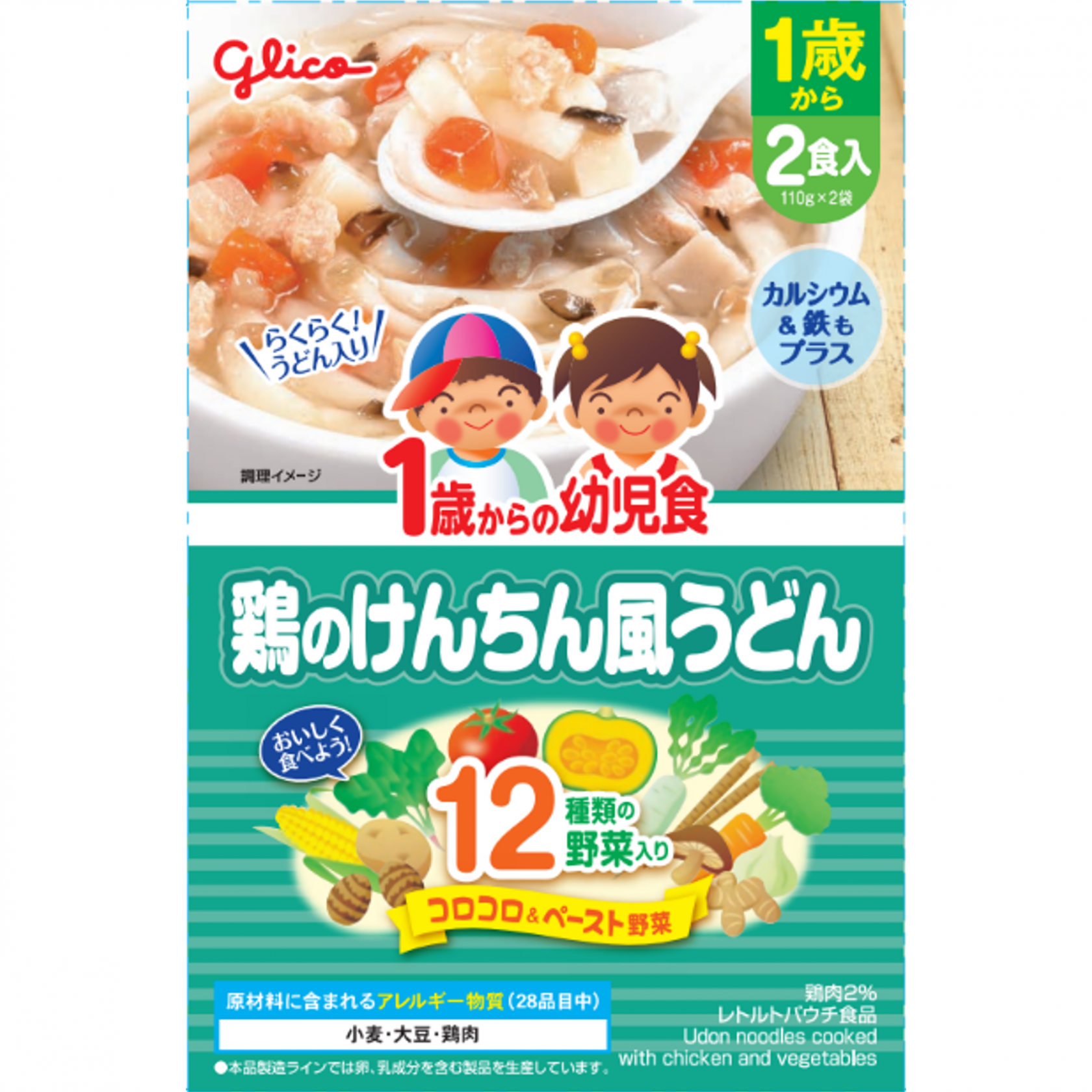 うどん(国内製造(小麦粉、食塩))、野菜(にんじん、さといも、じゃがいも、だいこん、ごぼう、しいたけ)、鶏肉、米でん粉、しょうゆ、砂糖、こんぶエキス、かつおエキス、かぼちゃペースト、ほうれん草ペースト、トマトペースト、とうもろこしペースト、しょうがペースト、発酵調味料、にんにくペースト、酵母エキス、デキストリン/グルコン酸Ca、ピロリン酸鉄、(一部に小麦・大豆・鶏肉を含む)