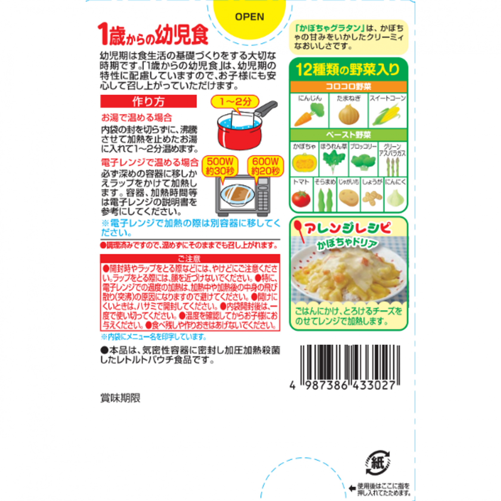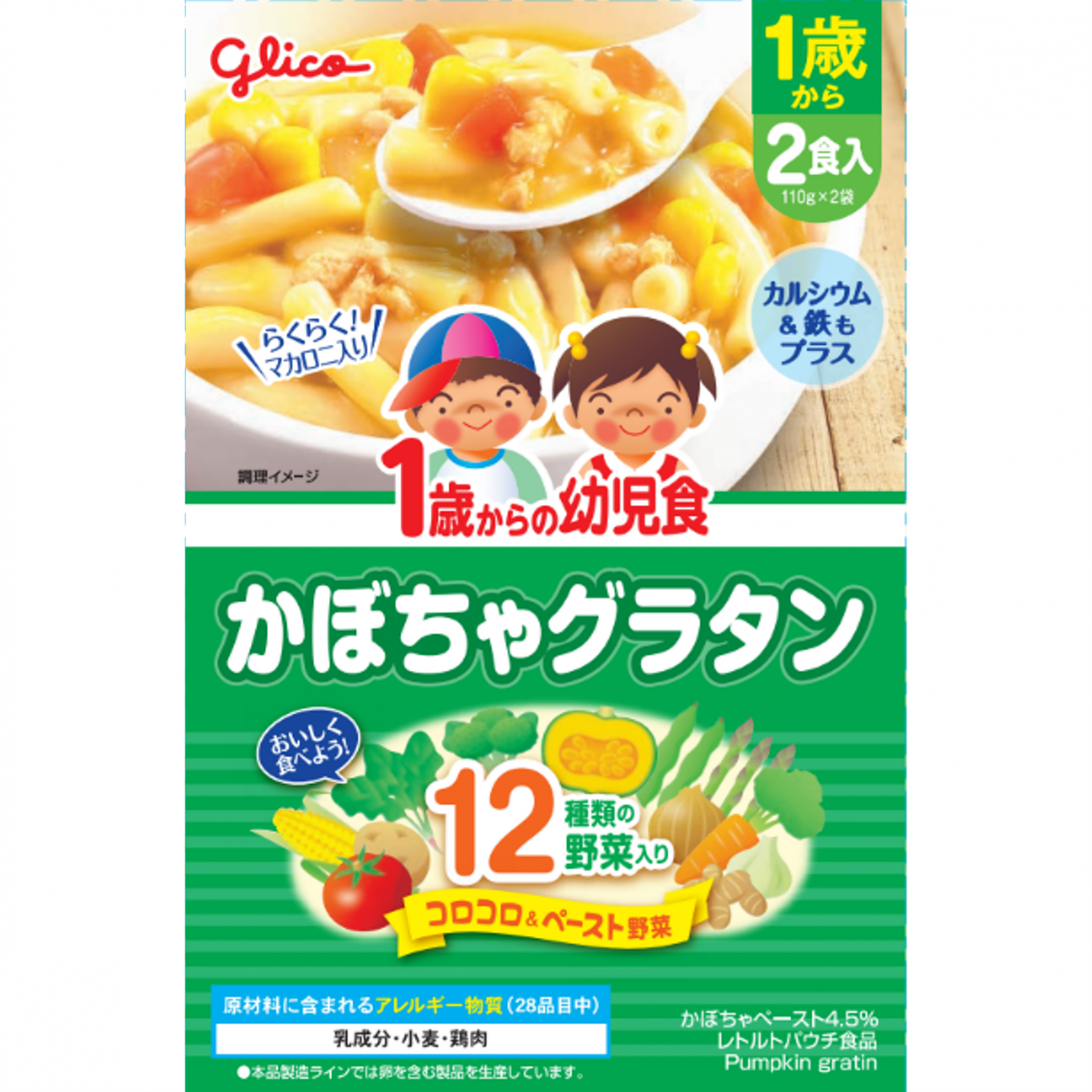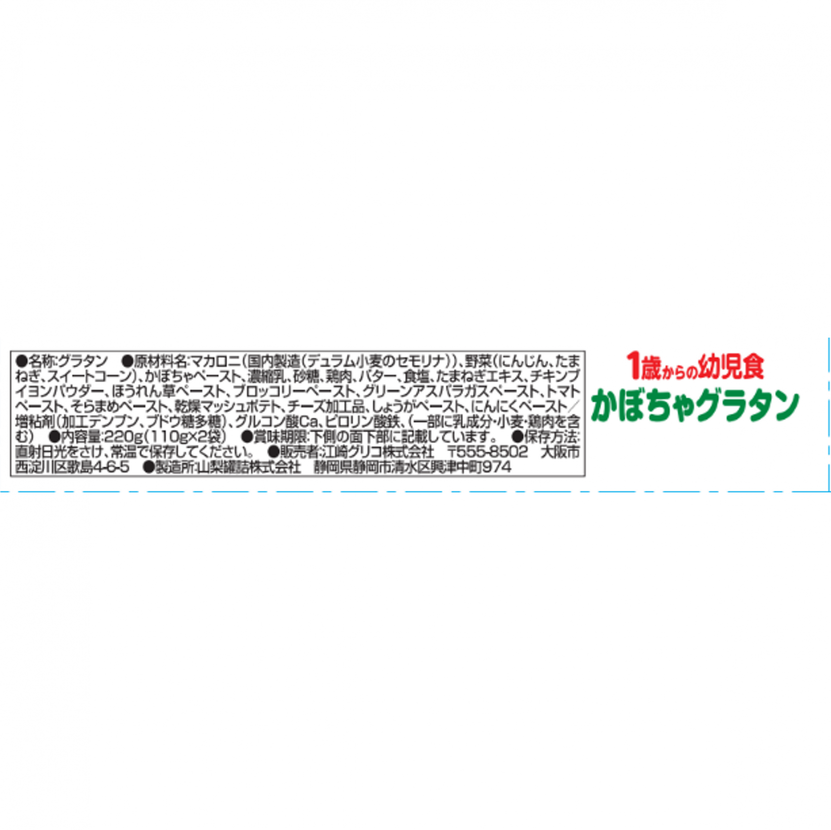 マカロニ(国内製造(デュラム小麦のセモリナ))、野菜(にんじん、たまねぎ、スイートコーン)、かぼちゃペースト、濃縮乳、砂糖、鶏肉、バター、食塩、たまねぎエキス、チキンブイヨンパウダー、ほうれん草ペースト、ブロッコリーペースト、グリーンアスパラガスペースト、トマトペースト、そらまめペースト、乾燥マッシュポテト、チーズ加工品、しょうがペースト、にんにくペースト/増粘剤(加工デンプン、ブドウ糖多糖)、グルコン酸Ca、ピロリン酸鉄、(一部に乳成分・小麦・鶏肉を含む)