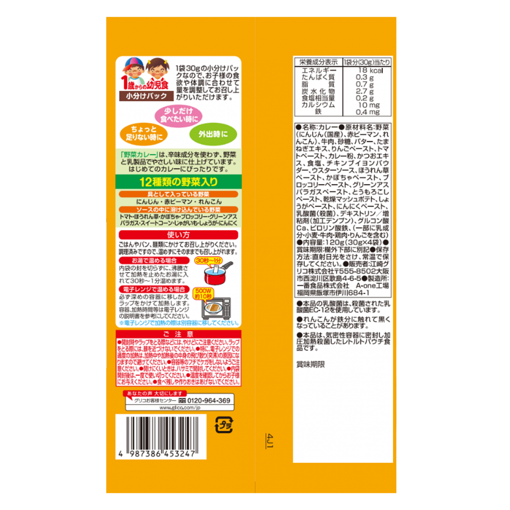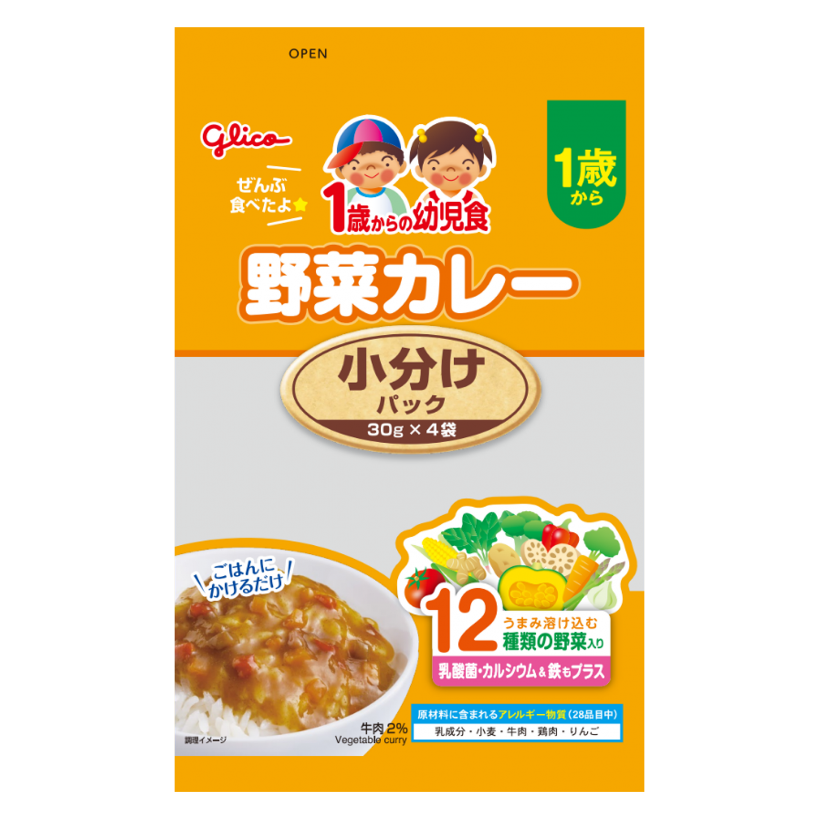 野菜(にんじん(国産)、赤ピーマン、れんこん)、牛肉、砂糖、バター、たまねぎエキス、りんごペースト、トマトペースト、カレー粉、かつおエキス、食塩、チキンブイヨンパウダー、ウスターソース、ほうれん草ペースト、かぼちゃペースト、ブロッコリーペースト、グリーンアスパラガスペースト、とうもろこしペースト、乾燥マッシュポテト、しょうがペースト、にんにくペースト、乳酸菌(殺菌)、デキストリン/増粘剤(加工デンプン)、グルコン酸Ca、ピロリン酸鉄、(一部に乳成分・小麦・牛肉・鶏肉・りんごを含む)