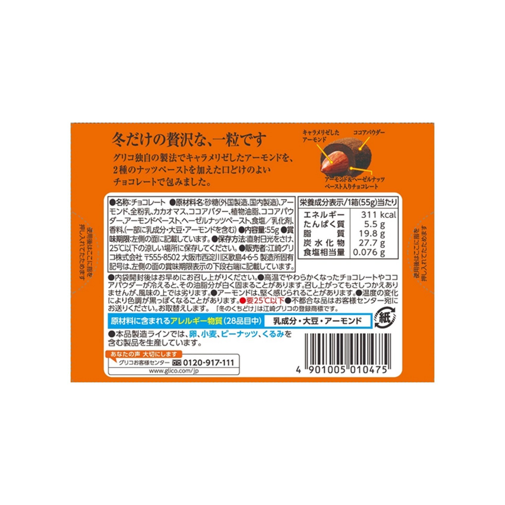 グリコ独自の製法でキャラメリゼした香ばしいアーモンドを、2種のナッツペーストを加えた口どけのよいチョコレートで包みました。