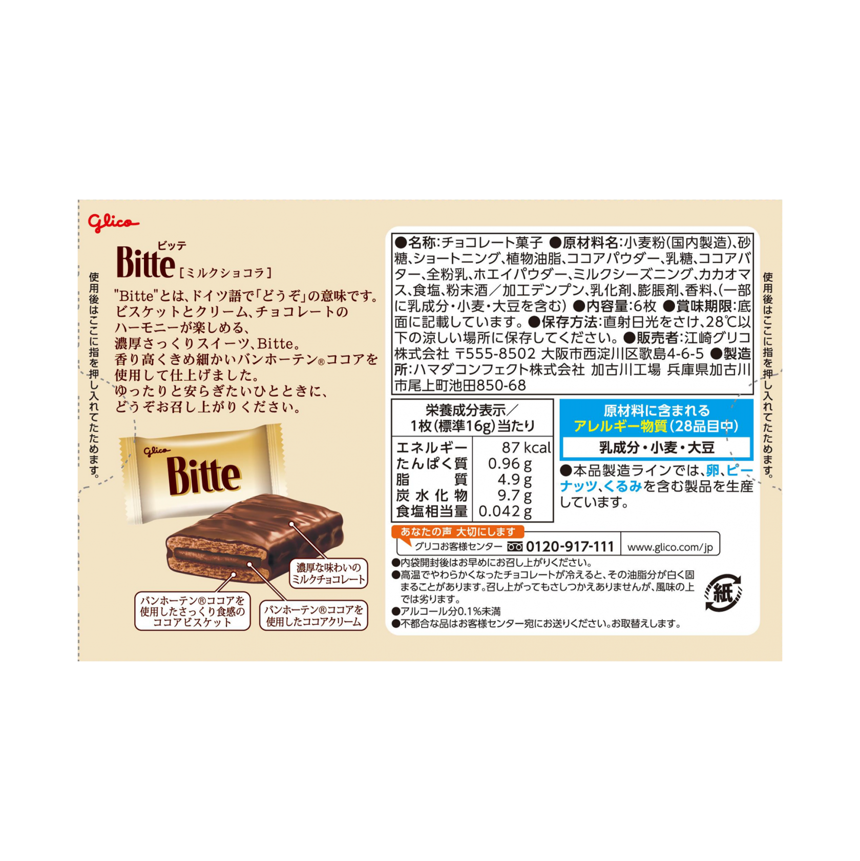 小麦粉(国内製造)、砂糖、ショートニング、植物油脂、ココアパウダー、乳糖、ココアバター、全粉乳、ホエイパウダー、ミルクシーズニング、カカオマス、食塩、粉末酒/加工デンプン、乳化剤、膨脹剤、香料、(一部に乳成分・小麦・大豆を含む)