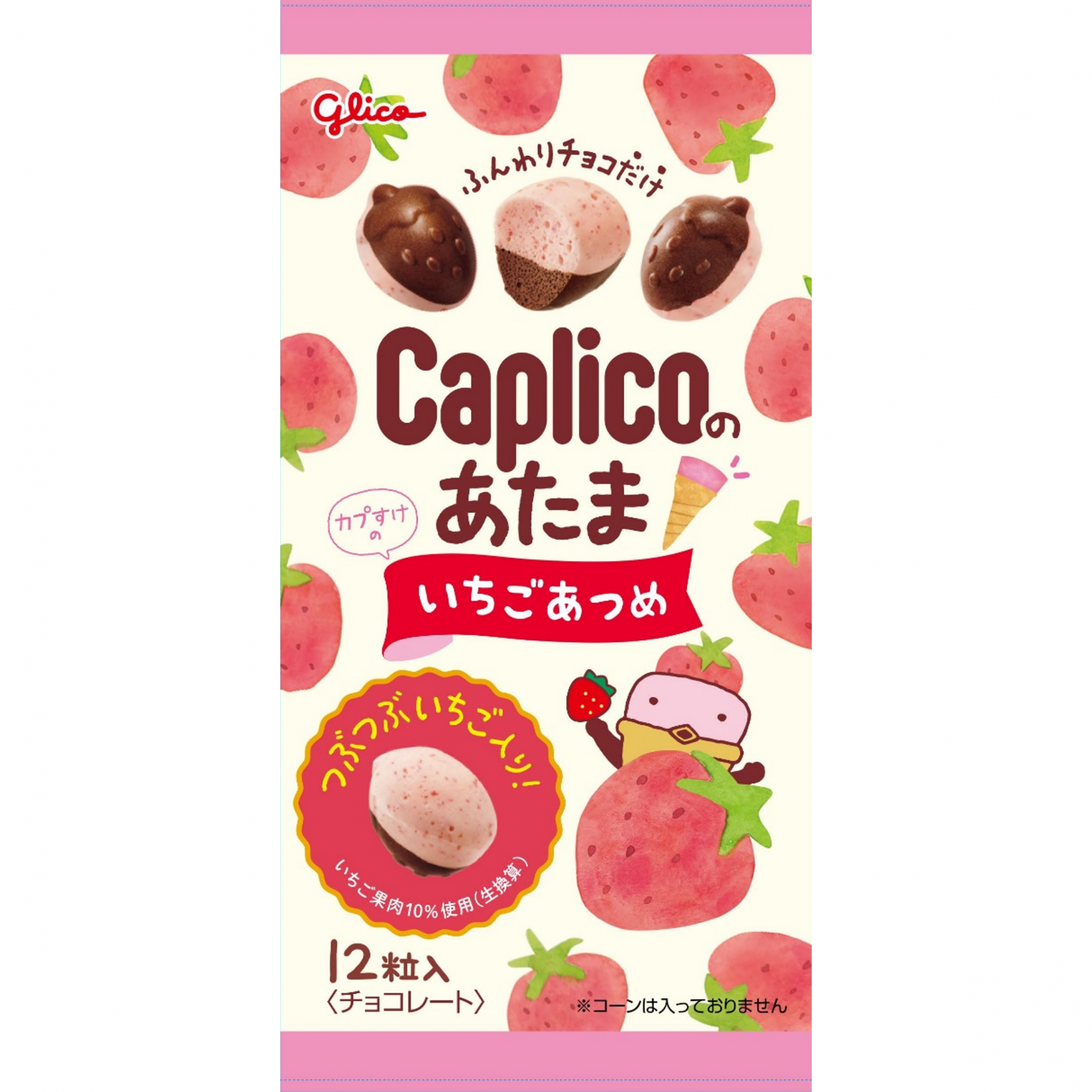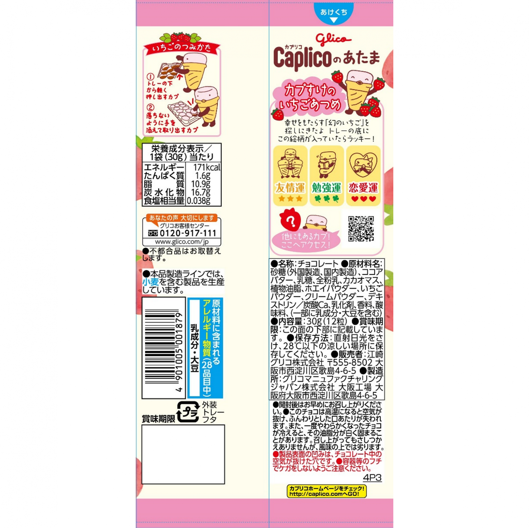 カプリコのエアインチョコ部分だけがトレーに入った、いちご形のチョコレートです。いちごとミルクチョコレートのおいしい組み合わせです。チョコレートの粒がスタートからゴールまで線でつながっていて、順番に食べすすめると、トレーの底に色々なキャラクターと出会えます。