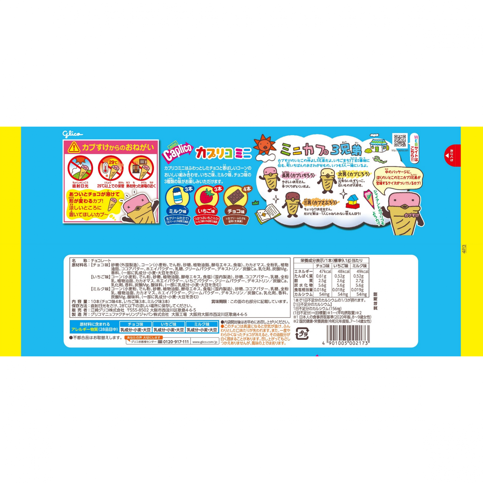 食べやすいスティックタイプのカプリコが10本入っています。チョコ、いちご、ミルクの3種類の味が入っていて親子で分け合って楽しめます。卵不使用。1日不足分のカルシウム入りです。(1本で1日不足分のカルシウムの1/3が摂れます。)