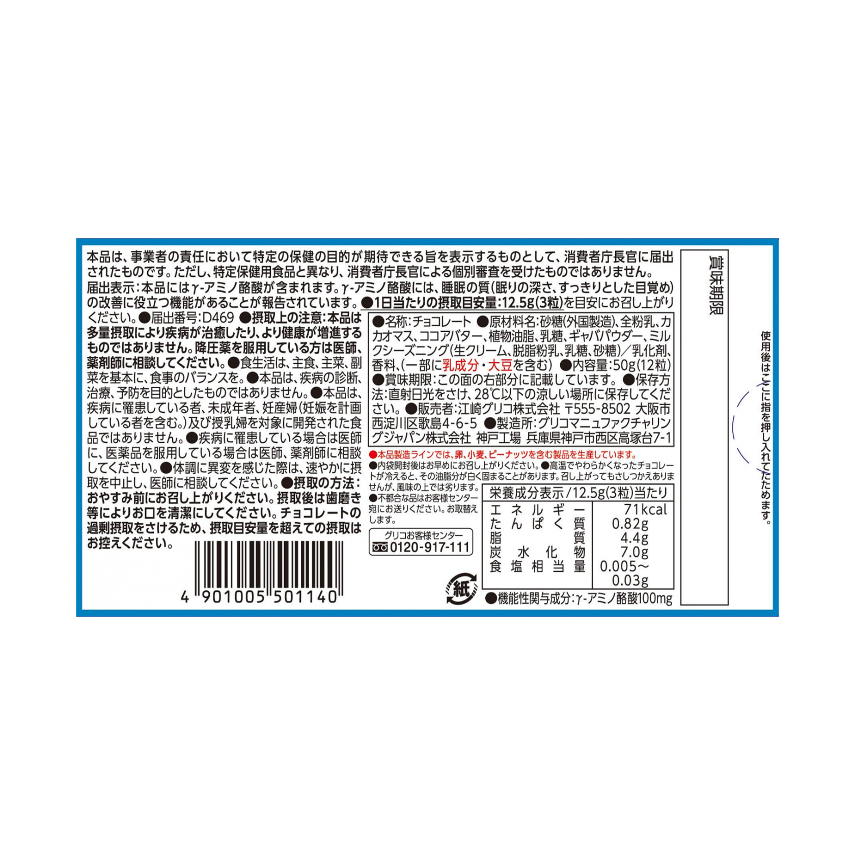 砂糖(外国製造)、全粉乳、カカオマス、ココアバター、植物油脂、乳糖、ギャバパウダー、ミルクシーズニング(生クリーム、脱脂粉乳、乳糖、砂糖)/乳化剤、香料、(一部に乳成分・大豆を含む)