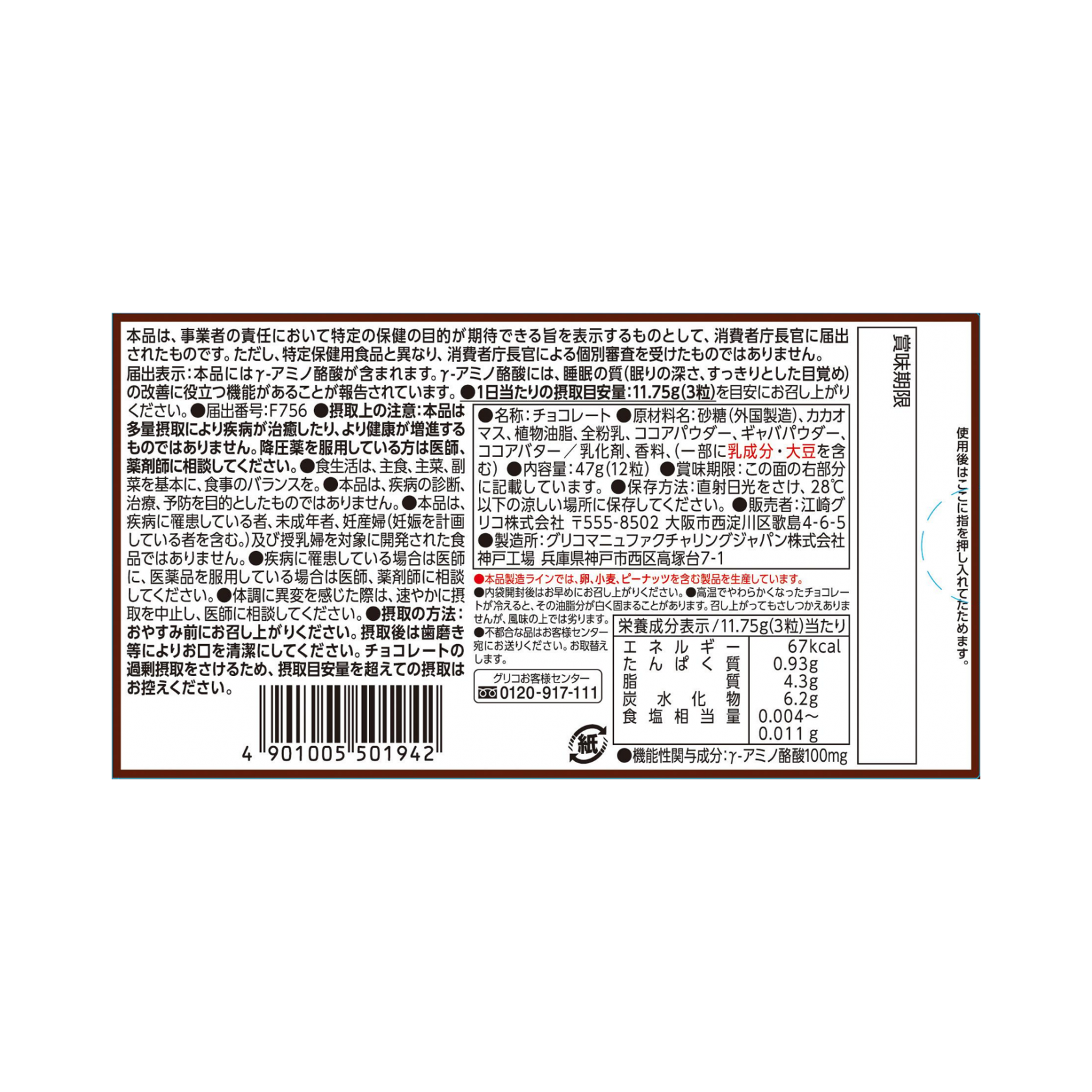 砂糖(外国製造)、カカオマス、植物油脂、全粉乳、ココアパウダー、ギャバパウダー、ココアバター/乳化剤、香料、(一部に乳成分・大豆を含む)