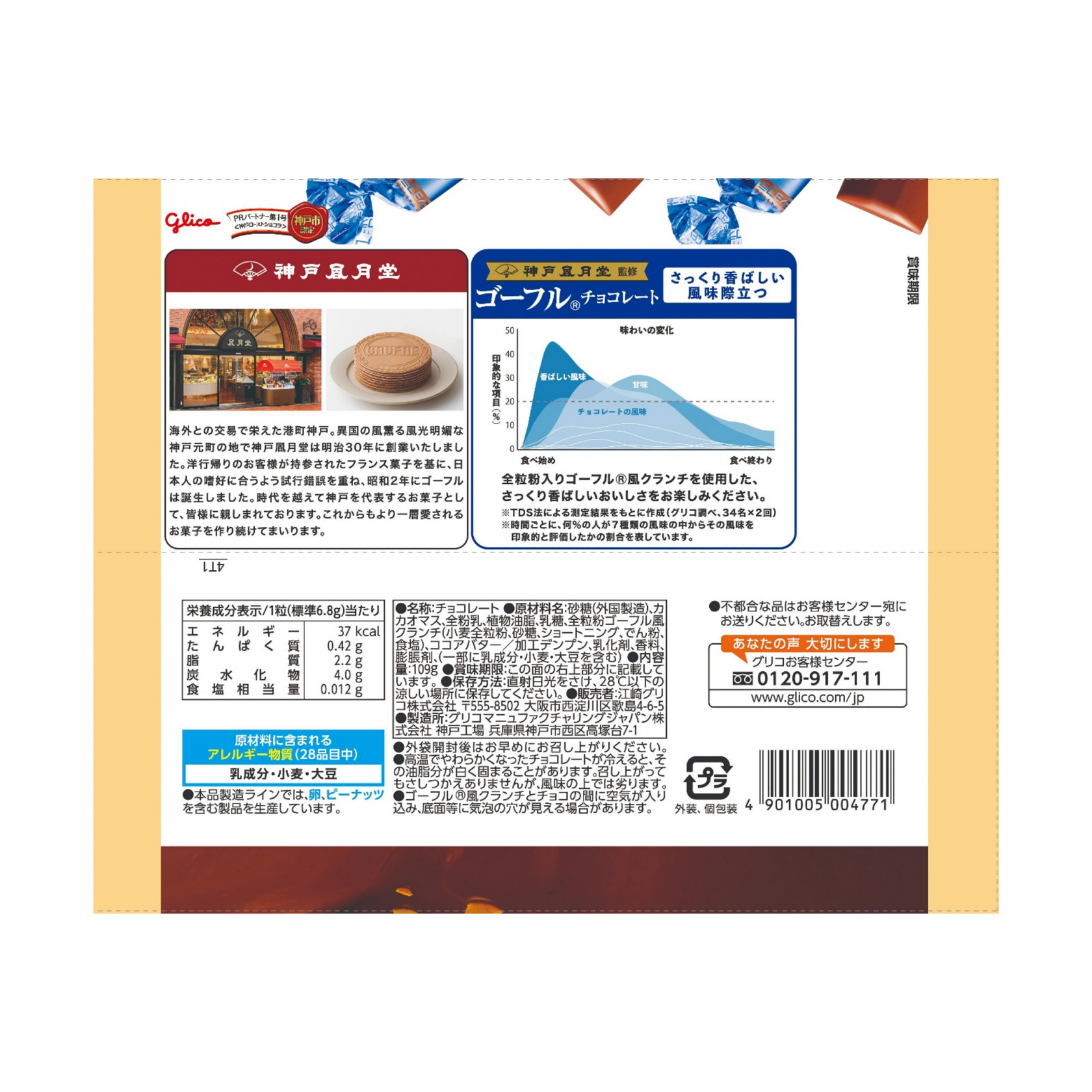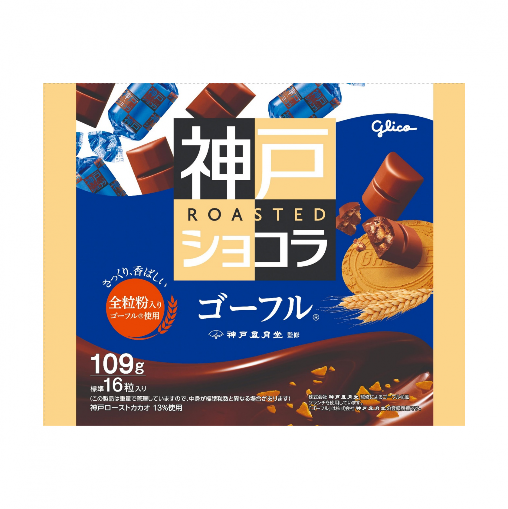 グリコ神戸工場で自家焙煎したカカオを使って丁寧に仕上げた、ちょっと贅沢な大人のための大粒ショコラです。株式会社神戸風月堂監修による全粒粉入りゴーフル(R)風クランチを使用した、さっくり軽快な食感と香ばしさが特長です。