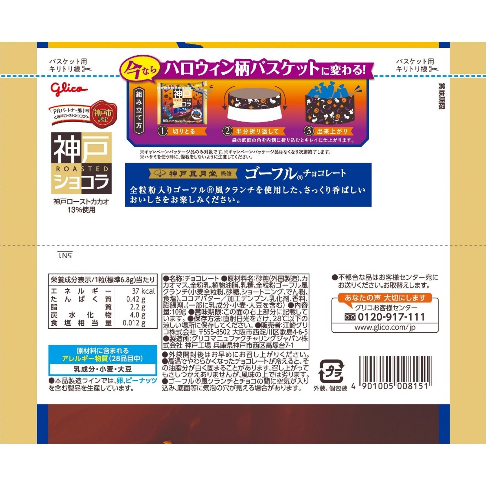 グリコ神戸工場で自家焙煎したカカオを使って丁寧に仕上げた、ちょっと贅沢な大人のための大粒ショコラです。株式会社神戸風月堂監修による全粒粉入りゴーフル(R)風クランチを使用した、さっくり軽快な食感と香ばしさが特長です。