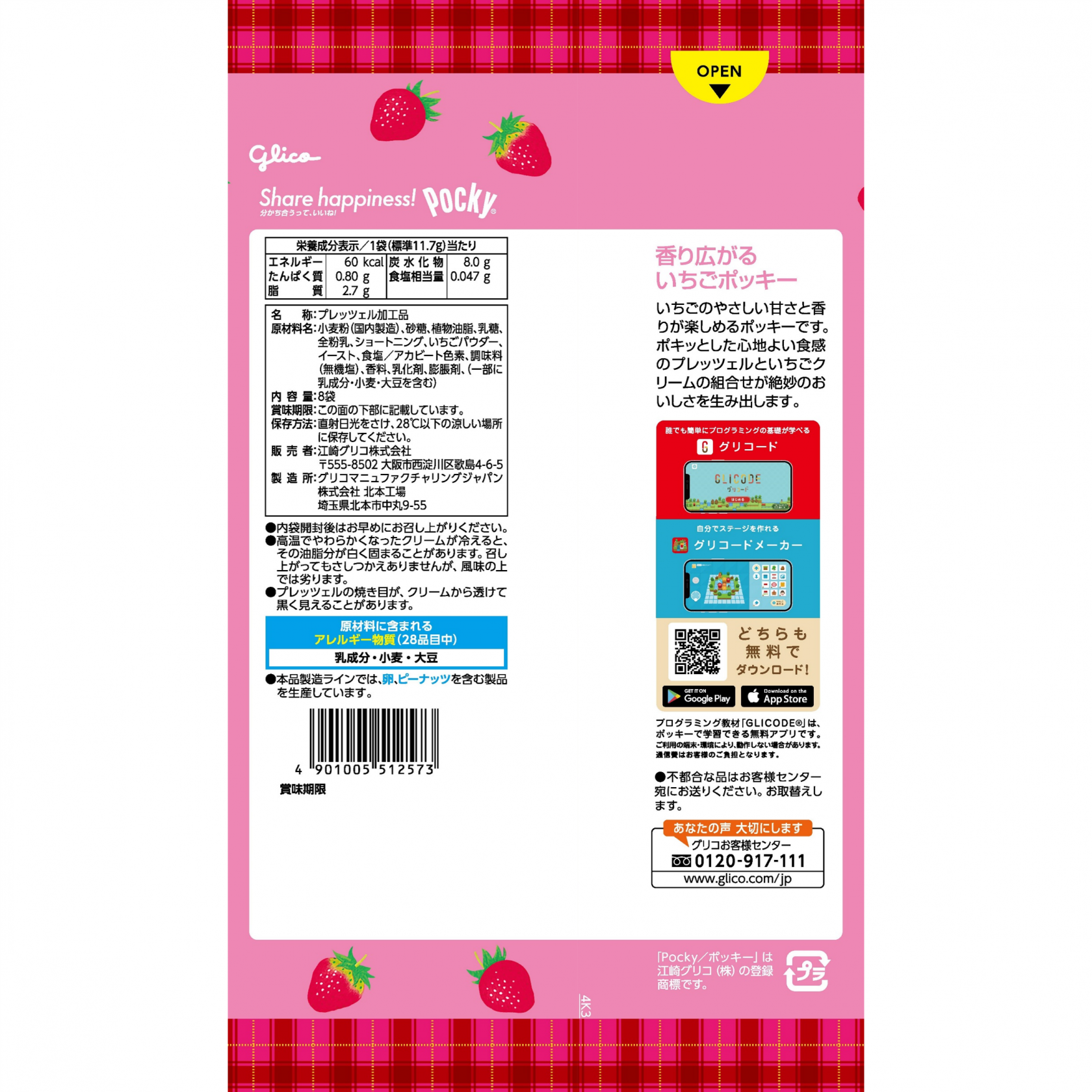 いちごのやさしい甘さと香りが楽しめるポッキーです。ポキッとした心地よい食感のプレッツェルといちごクリームの組合せが絶妙のおいしさを生み出します。 ご家庭での買い置きに便利な8袋入り。