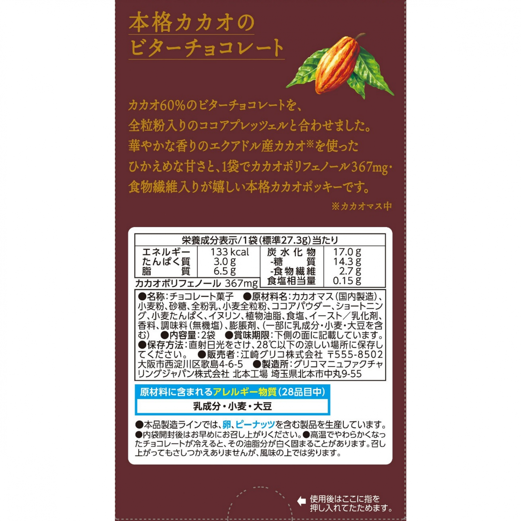 本格カカオのビターチョコレート。カカオ60%のビターチョコレートを、全粒粉入りのココアプレッツェルと合わせました。華やかな香りのエクアドル産カカオ※を使ったひかえめな甘さと、1袋でカカオポリフェノール367㎎・食物繊維入りが嬉しい本格カカオポッキーです。(※カカオマス中)