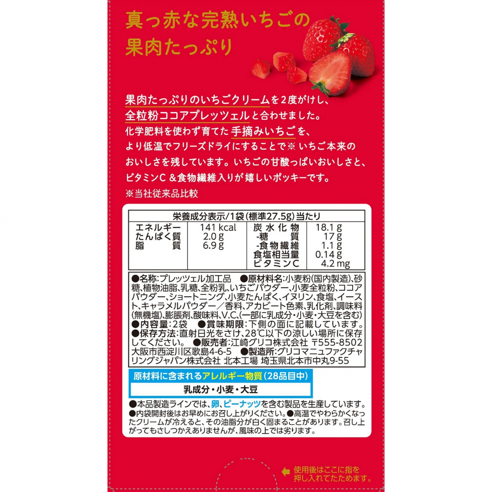 果肉たっぷりのいちごクリームを2度がけし、全粒粉ココアプレッツェルと合わせました。化学肥料を使わず育てた手摘みいちごを、より低温でフリーズドライにすることで※いちご本来のおいしさを残しています。いちごの甘酸っぱいおいしさと、ビタミンC&食物繊維入りが嬉しいポッキーです。※当社従来品比較