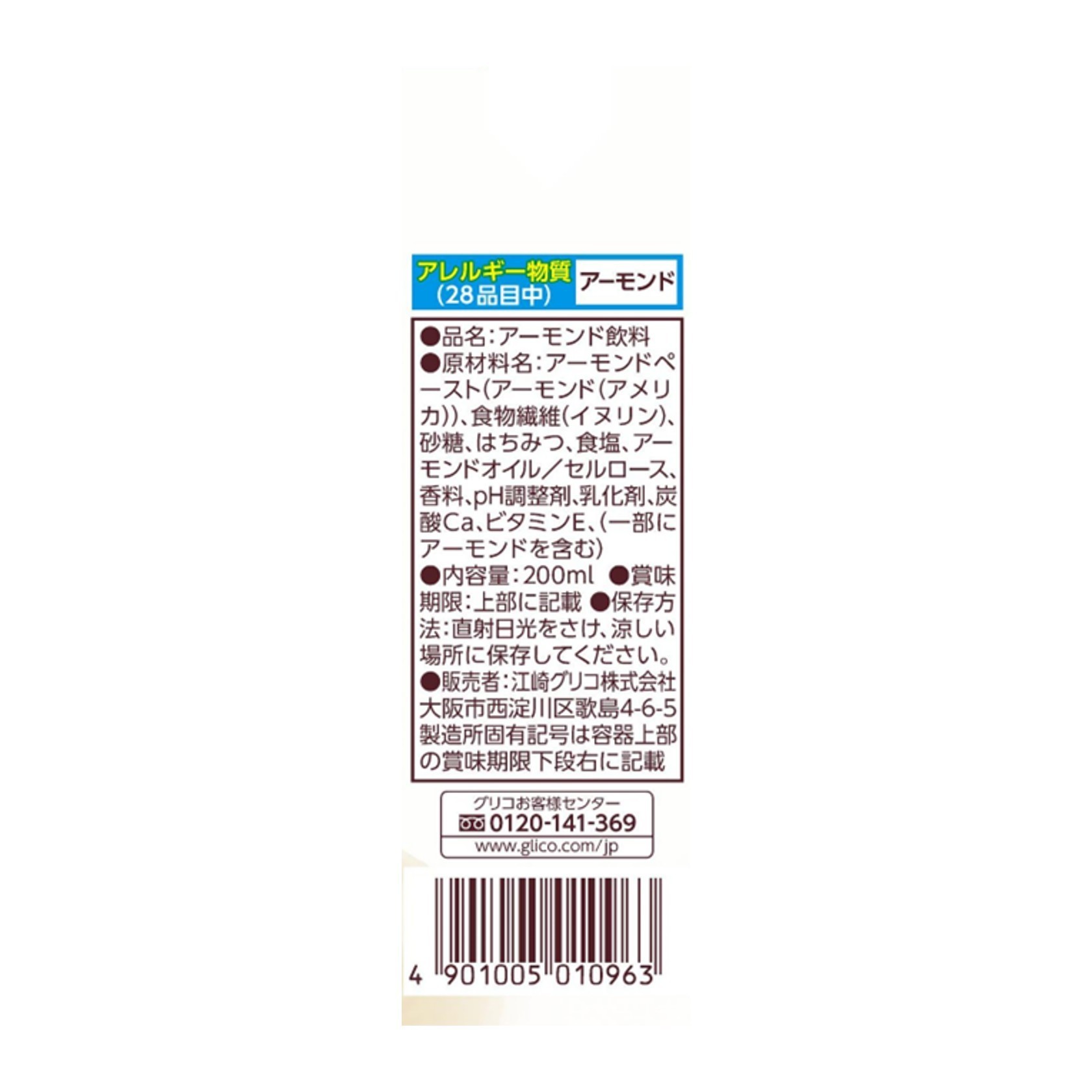 アーモンドペースト(アーモンド(アメリカ))、食物繊維(イヌリン)、砂糖、はちみつ、食塩、アーモンドオイル/セルロース、香料、pH調整剤、乳化剤、炭酸Ca、ビタミンE、(一部にアーモンドを含む)