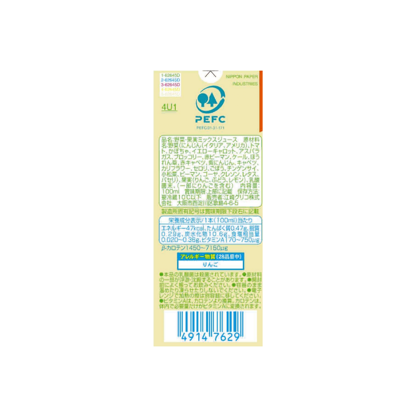 見出し(表示されません) 見出し(表示されません) エネルギー 47kcal たんぱく質 0.47g 脂質 0.29g 炭水化物 10.6g 食塩相当量 0.020~0.36g ビタミンA 170~750μg 参考値 1本(100ml)当たり