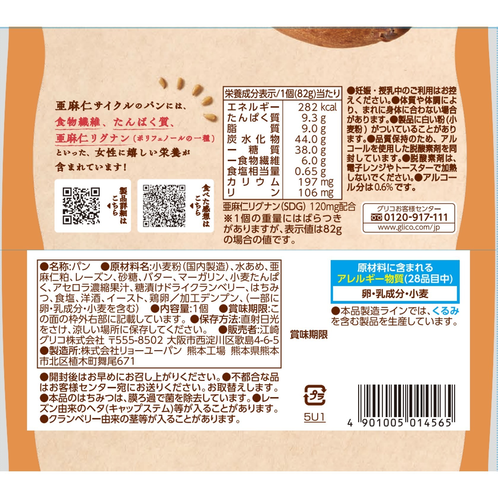 小麦粉(国内製造)、水あめ、亜麻仁粕、レーズン、砂糖、バター、マーガリン、小麦たんぱく、アセロラ濃縮果汁、糖漬けドライクランベリー、はちみつ、食塩、洋酒、イースト、鶏卵/加工デンプン、(一部に卵・乳成分・小麦を含む)