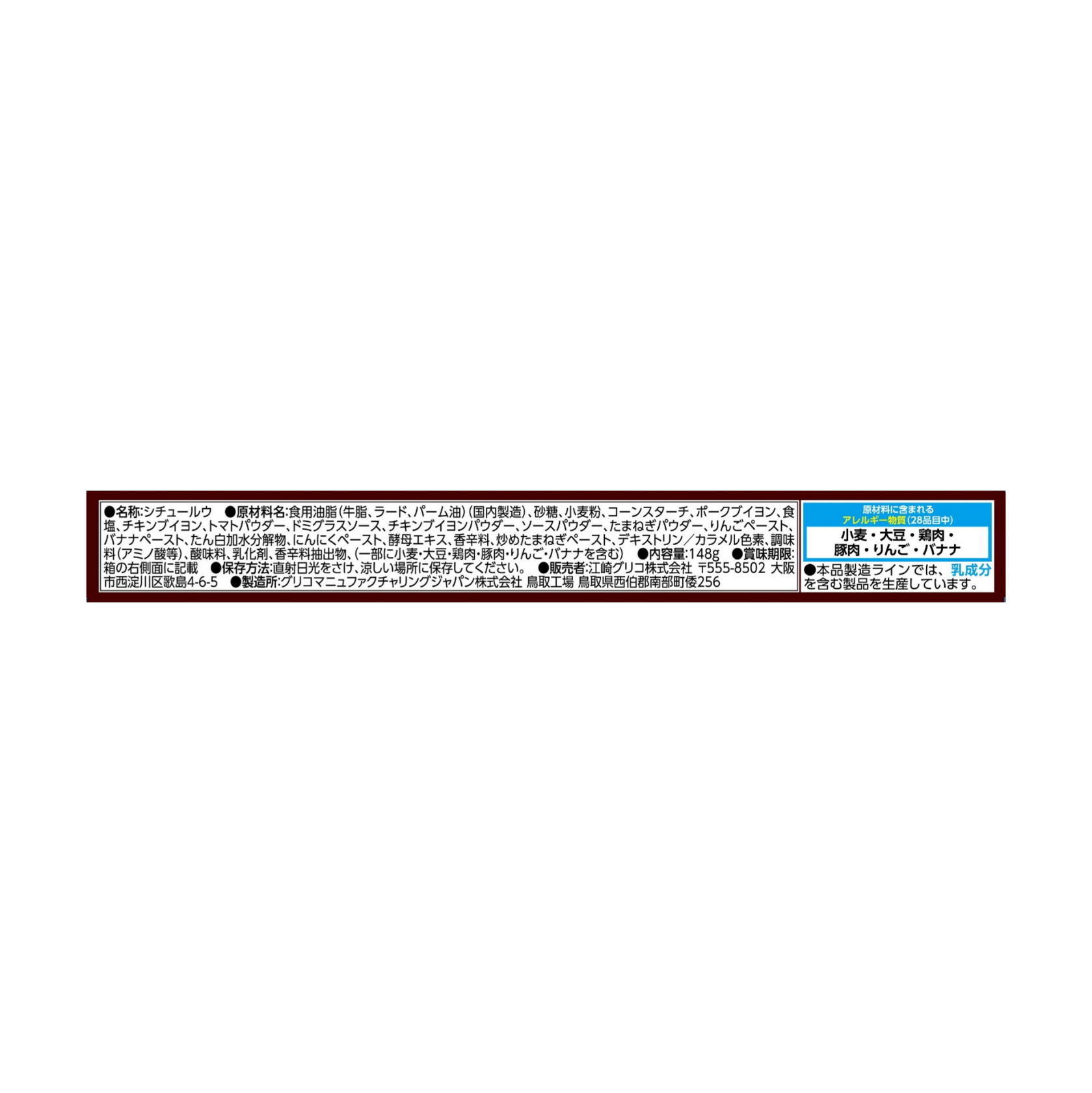 食用油脂(牛脂、ラード、パーム油)(国内製造)、砂糖、小麦粉、コーンスターチ、ポークブイヨン、食塩、チキンブイヨン、トマトパウダー、ドミグラスソース、チキンブイヨンパウダー、ソースパウダー、たまねぎパウダー、りんごペースト、バナナペースト、たん白加水分解物、にんにくペースト、酵母エキス、香辛料、炒めたまねぎペースト、デキストリン/カラメル色素、調味料(アミノ酸等)、酸味料、乳化剤、香辛料抽出物、(一部に小麦・大豆・鶏肉・豚肉・りんご・バナナを含む)