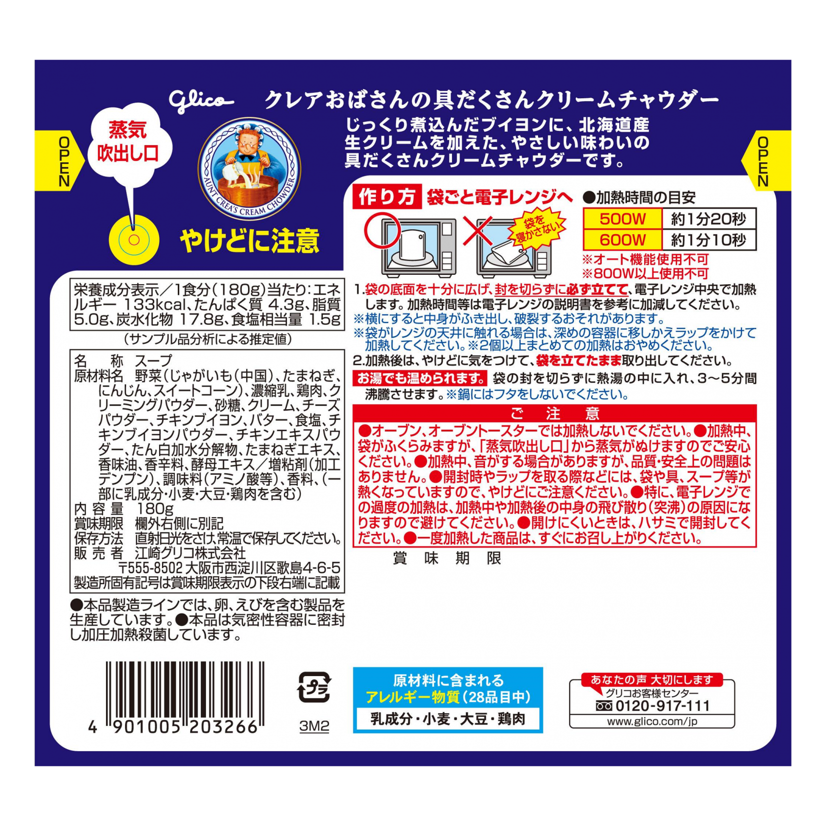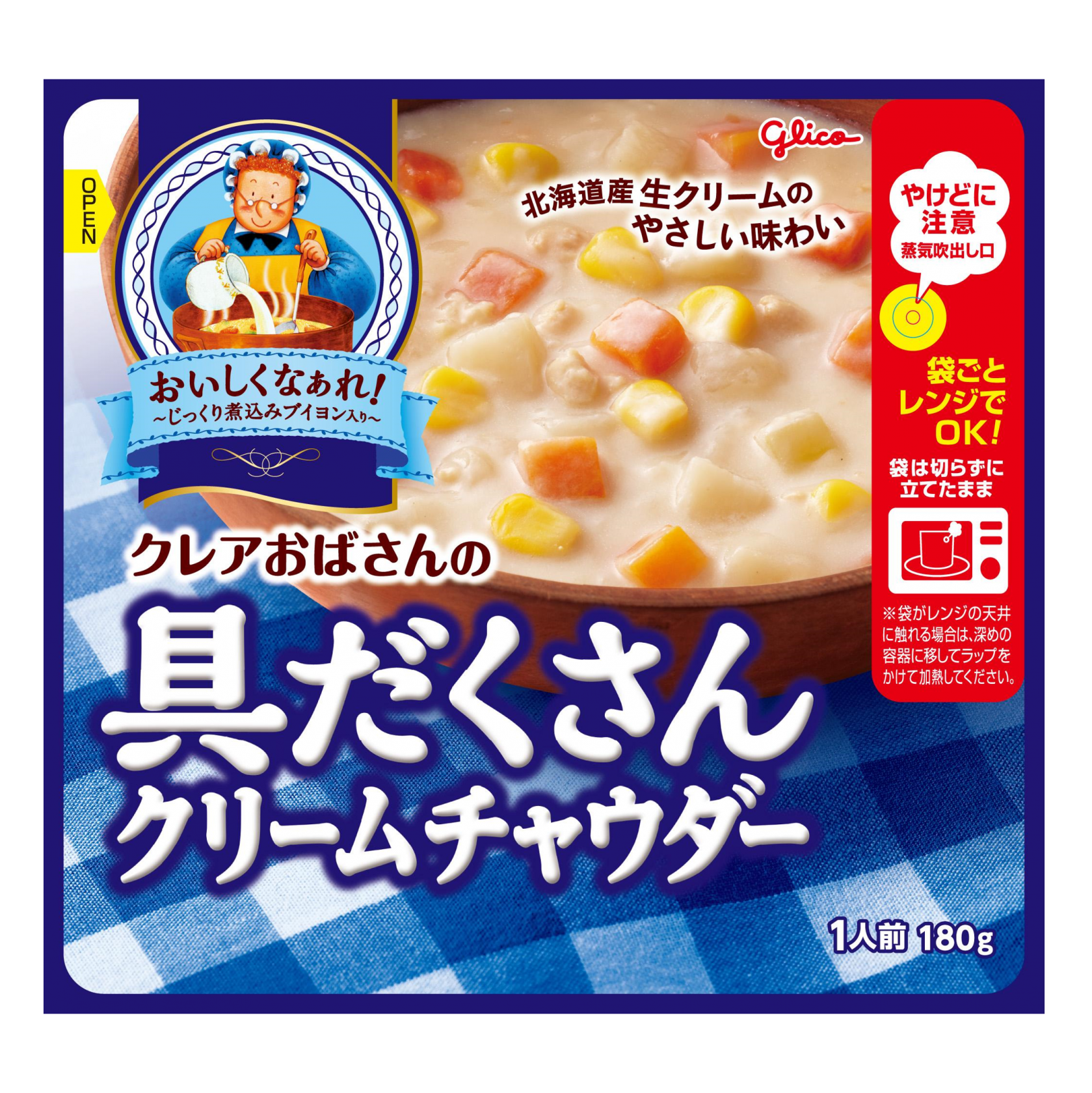 クレアおばさんこだわりのブイヨンをベースに仕上げた、やさしい味わ いです。北海道産生クリームを使用し、クリーミーに仕上げました。にんじん、じゃがいもなどの野菜がたっぷり入って具だくさん。じっくり煮込まれたようなとろみが、満足感のある食べ応えです。電子レンジ対応パウチなので袋ごと加熱でき、お湯を沸かすなどの手間がかかりません。