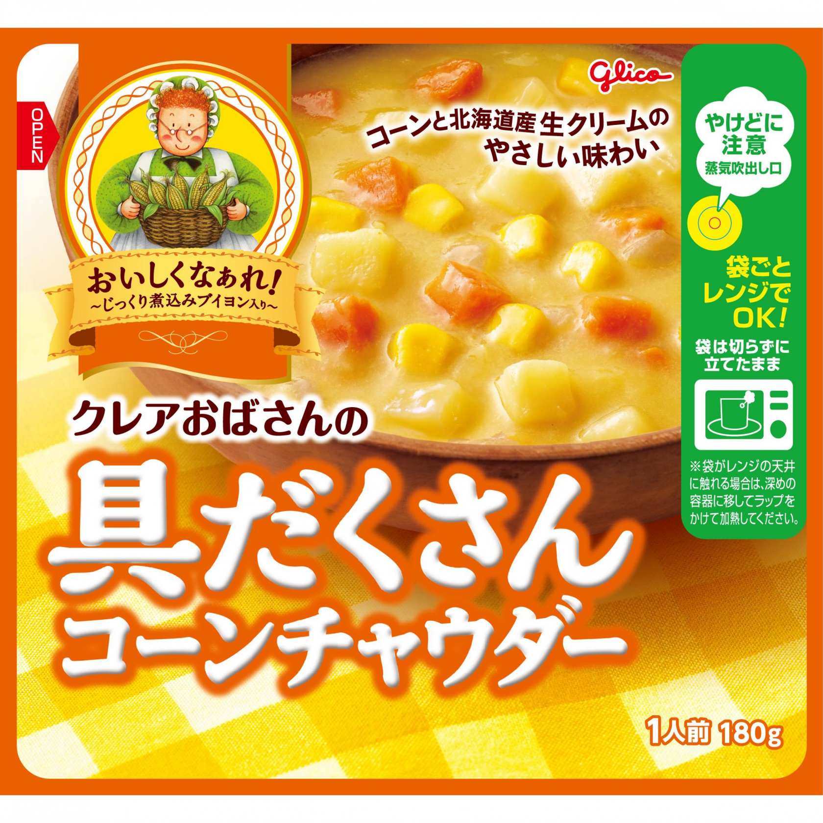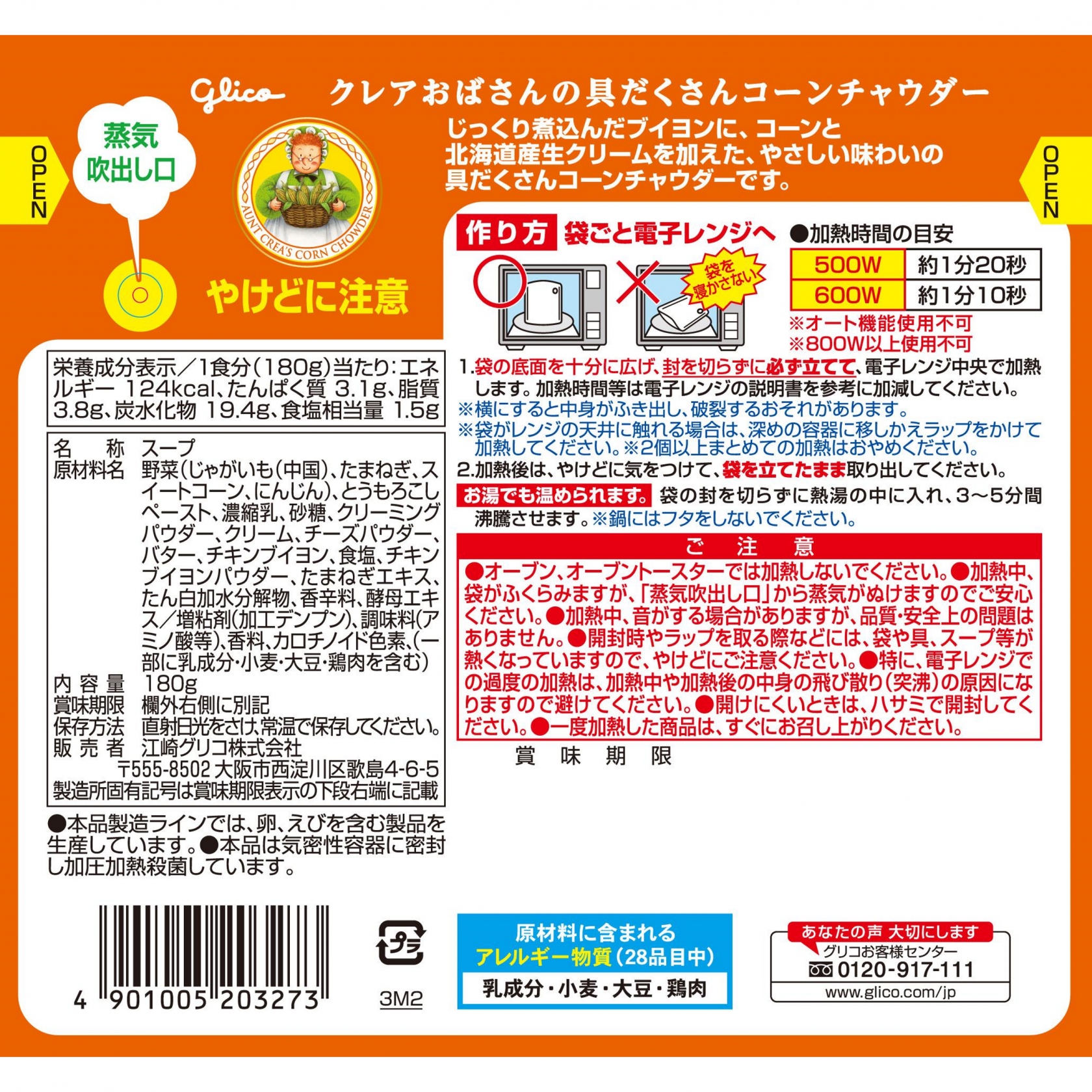クレアおばさんこだわりのブイヨンをベースに仕上げた、やさしい味わ いです。甘みのあるコーンと北海道産生クリームが溶け込んでいます。じゃがいも、たまねぎ、スイートコーン、にんじんなどの野菜がたっぷり入って具だくさん。じっくり煮込まれたようなとろみが、満足感のある食べ応えです。電子レンジ対応パウチなので袋ごと加熱でき、お湯を沸かすなどの手間がかかりません。