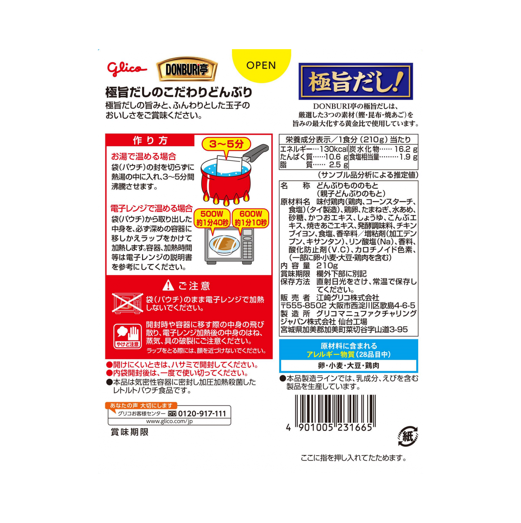 味付鶏肉(鶏肉、コーンスターチ、食塩)(タイ製造)、鶏卵、たまねぎ、水あめ、砂糖、かつおエキス、しょうゆ、こんぶエキス、焼きあごエキス、発酵調味料、チキンブイヨン、食塩、香辛料/増粘剤(加工デンプン、キサンタン)、リン酸塩(Na)、香料、酸化防止剤(V.C)、カロチノイド色素、(一部に卵・小麦・大豆・鶏肉を含む)