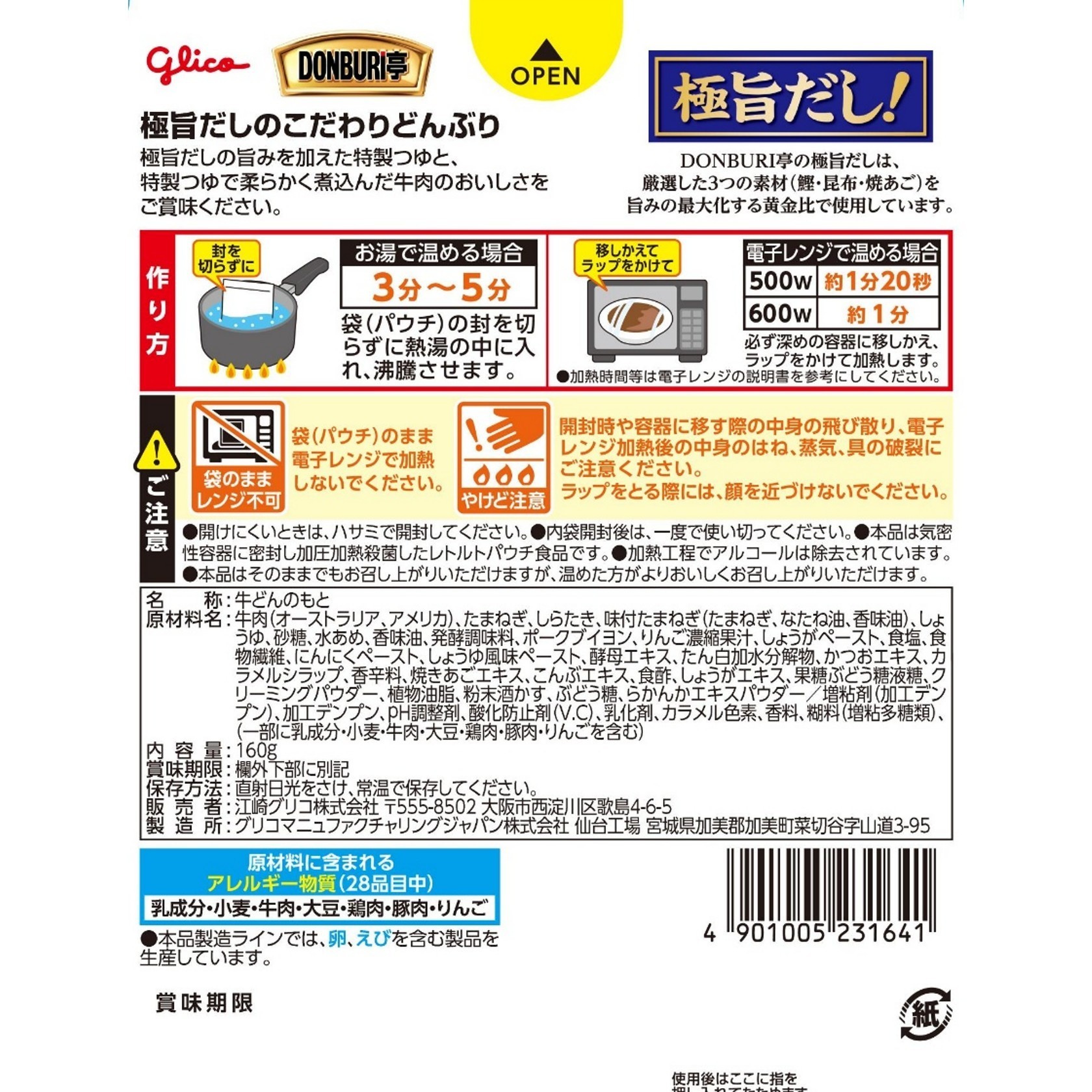 牛肉(オーストラリア、アメリカ)、たまねぎ、しらたき、味付たまねぎ(たまねぎ、なたね油、香味油)、しょうゆ、砂糖、水あめ、香味油、発酵調味料、ポークブイヨン、りんご濃縮果汁、しょうがペースト、食塩、食物繊維、にんにくペースト、しょうゆ風味ペースト、酵母エキス、たん白加水分解物、かつおエキス、カラメルシラップ、香辛料、焼きあごエキス、こんぶエキス、食酢、しょうがエキス、果糖ぶどう糖液糖、クリーミングパウダー、植物油脂、粉末酒かす、ぶどう糖、らかんかエキスパウダー/増粘剤(加工デンプン)、加工デンプン、pH調整剤、酸化防止剤(V.C)、乳化剤、カラメル色素、香料、糊料(増粘多糖類)、(一部に乳成分・小麦・牛肉・大豆・鶏肉・豚肉・りんごを含む)