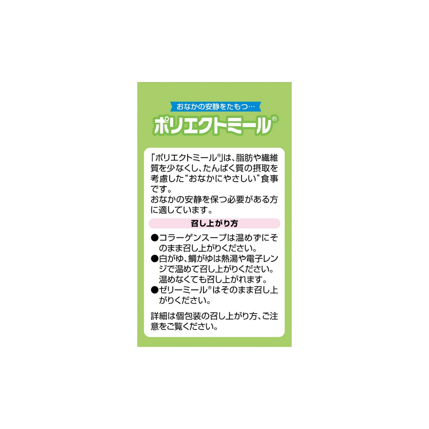 ■ポリエクトミールは、脂肪や繊維質を少なくし、たんぱく質の摂取を考慮した”おなかにやさしい”食事です。おなかの安静を保つ必要がある方に適しています。 ■調理が簡単で、おいしく召し上がりいただけます。